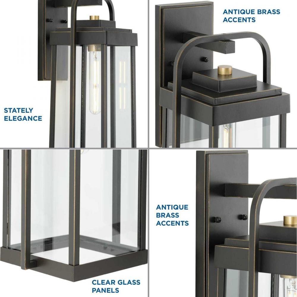 Combine a stately elegance with modern style with the Walcott Collection. The wall lantern's distinctive elongated frame holds clear glass panels. The frame is coated in a handsome antique bronze finish punctuated with brass-tone accents to add vintage charm.