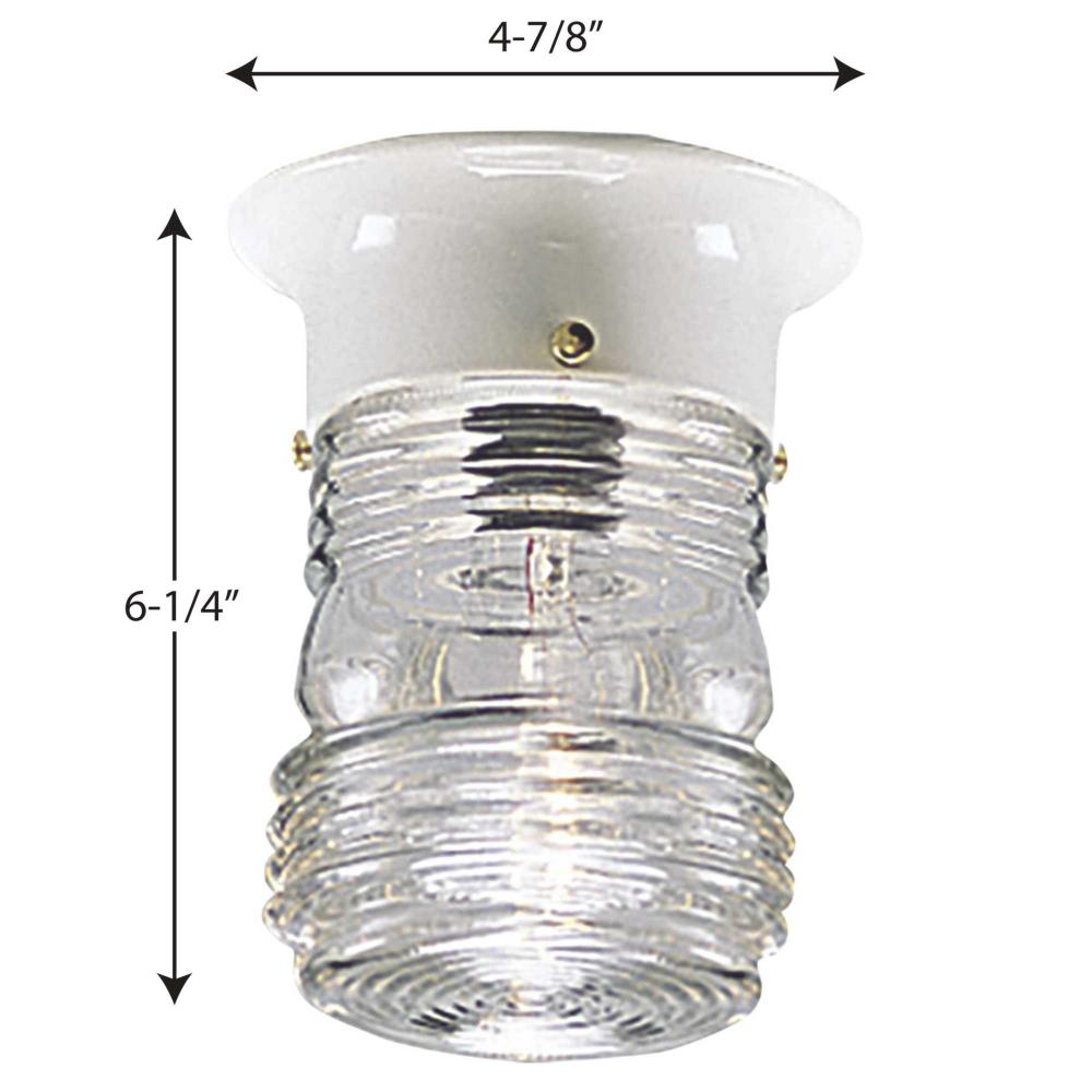 An outdoor "jelly jar" utility flush mount featuring a white powder-coated finish and clear marine glass. The fixture is wet location listed and ideal for outdoor spaces. The glass shape is a reminder of the old-fashioned jelly jars.