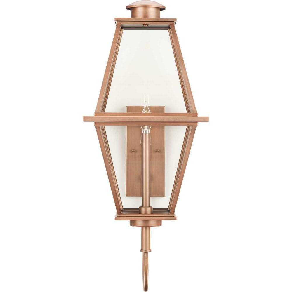 The Bradshaw Collection nods to historical style with its traditional lantern design, beautifully updating a homes curb appeal. A comforting glow is diffused through clear glass panes, creating a warm and romantic ambiance.The gracious lines of this large wall lantern, finished in mellow painted antique copper, elegantly complement exteriors of traditional, transitional and farmhouse settings. It is cULus wet location listed for use where water may be present, with a one-year warranty to guarantee your complete satisfaction. Progress Lighting products are designed for exceptional quality, reliability, and functionality.