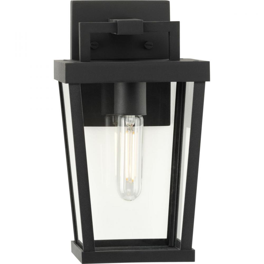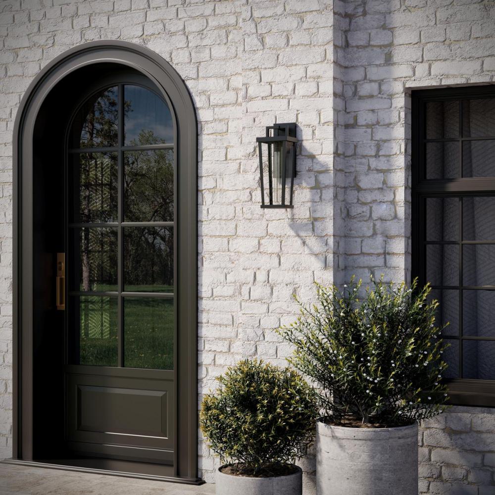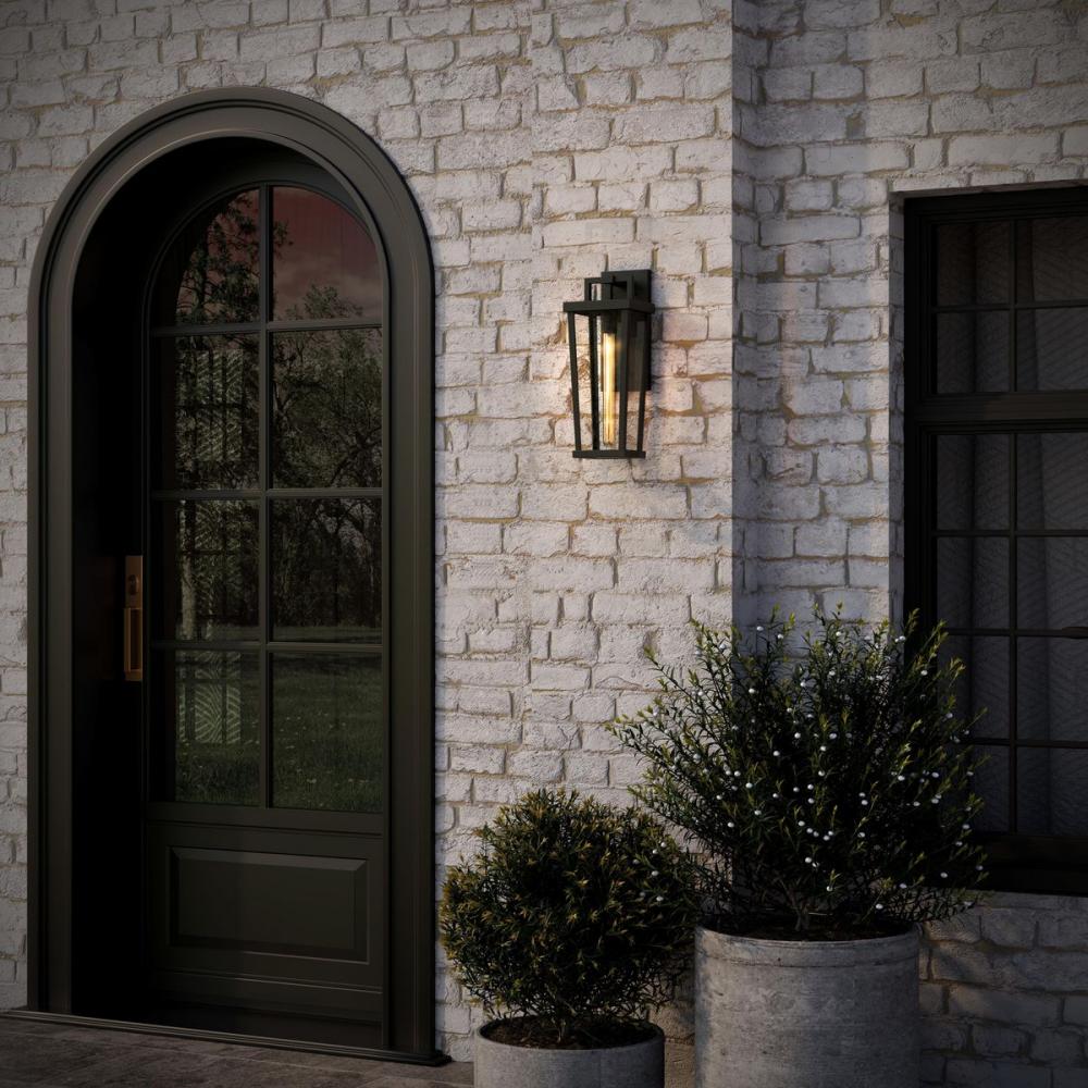 The Tryon Outdoor Wall Lantern features an elongated, tapered geometric frame finished in classic black that exudes refined simplicity. A sleek, squared arch connects the minimalist frame to the backplate while clear glass panels beautifully showcase a sin