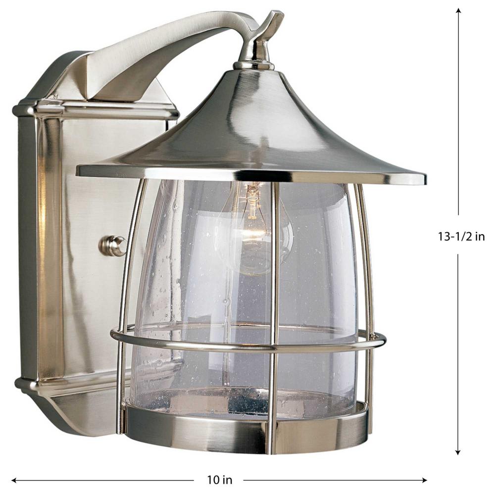 Unique cantilevered arms, distinctive roof and wire frames surround clear seeded glass. Aluminum and Brass construction. One-light large wall lantern. Brushed Nickel finish.