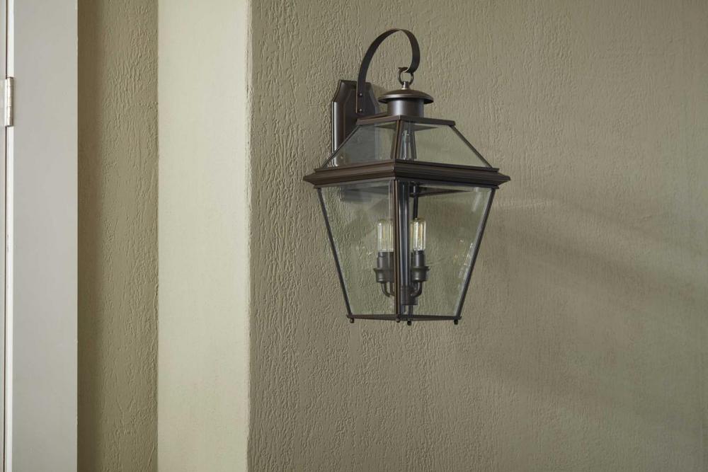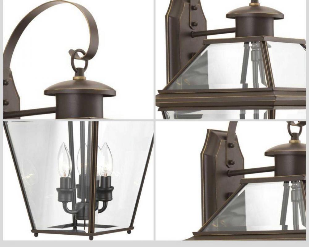 The three-light wall lantern from the Burlington outdoor collection is constructed from aluminum for durable, weather-resistant performance. An Antique Bronze finish complements the clear beveled glass. Open bottom design allows individuals to replace lamps without removing any glass shade.