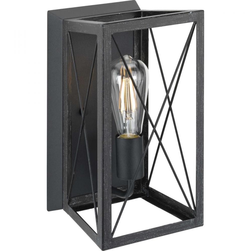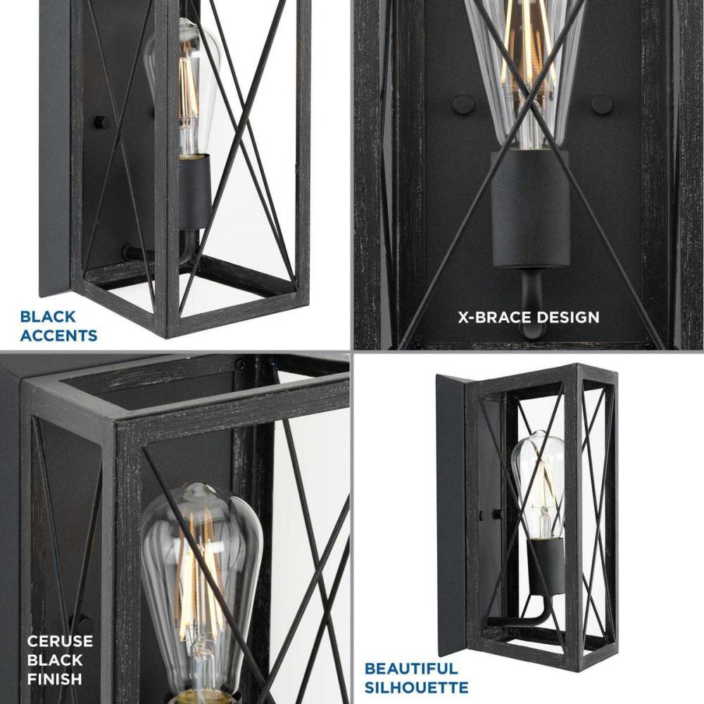 Create a rustic atmosphere with a wall sconce from the Briarwood Collection. A light source exudes a comforting country glow through the X-brace design reminiscent of country barn doors and rustic farmhouse gates. The faux wood frame is coated in a cerused black oak finish accented by a textured black wall plate. Compatible with dimmable bulbs.