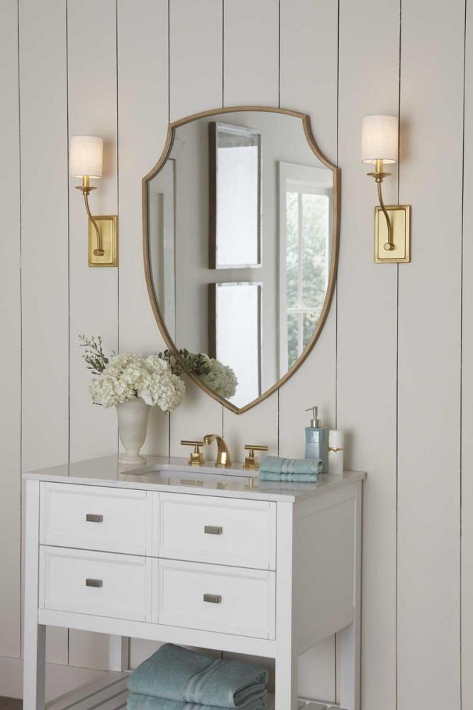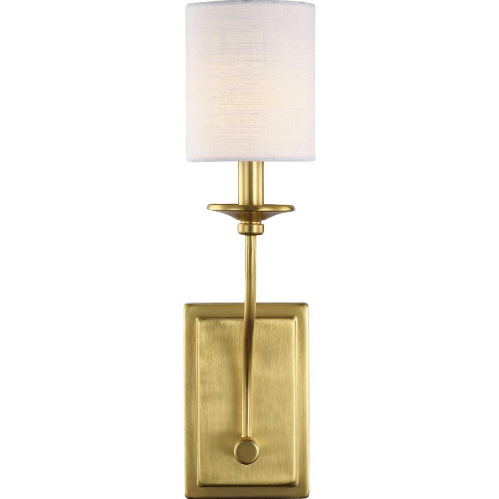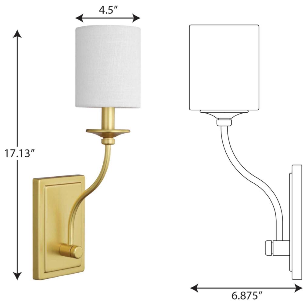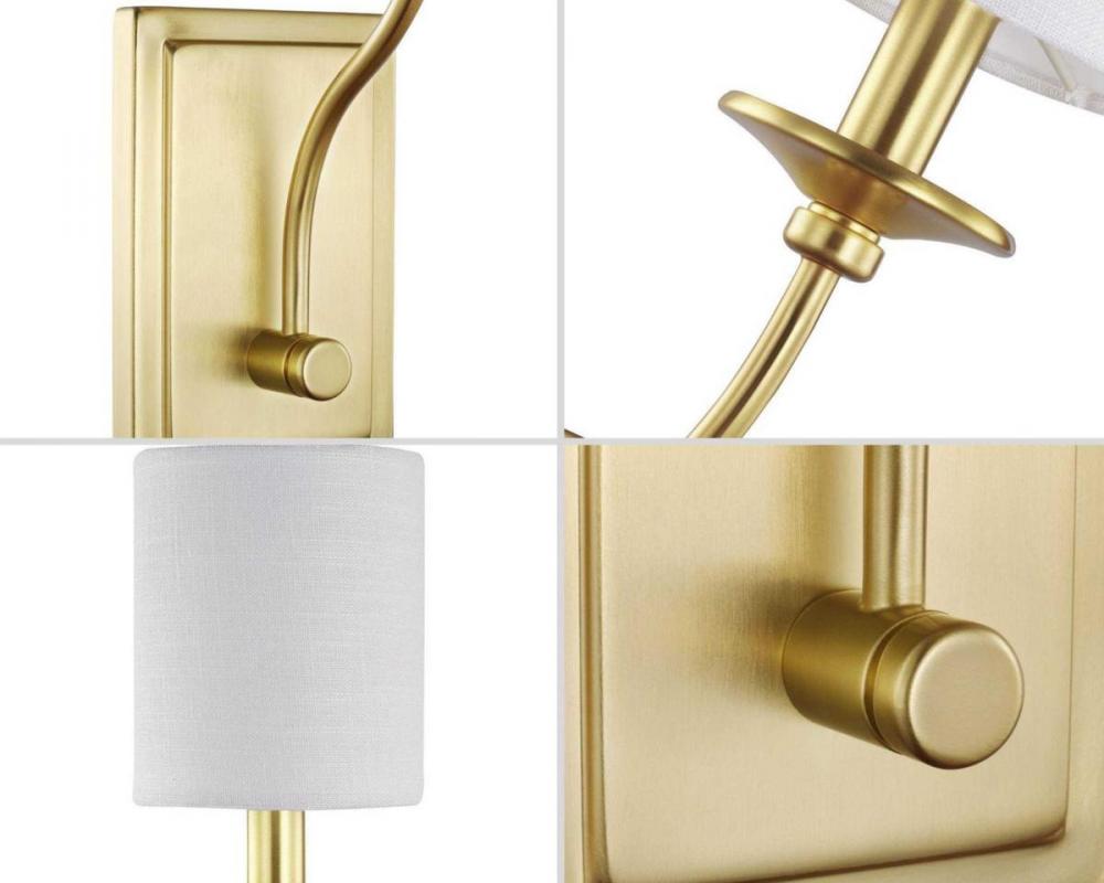 Inspired at its roots by an understated beauty and a breathtaking formal elegance, this wall sconce will make a stunning addition to any luxurious living space. A satin brass arm flows down from an ornamental light base to a rectangular backplate. On top of the light base sits a summer linen shade.