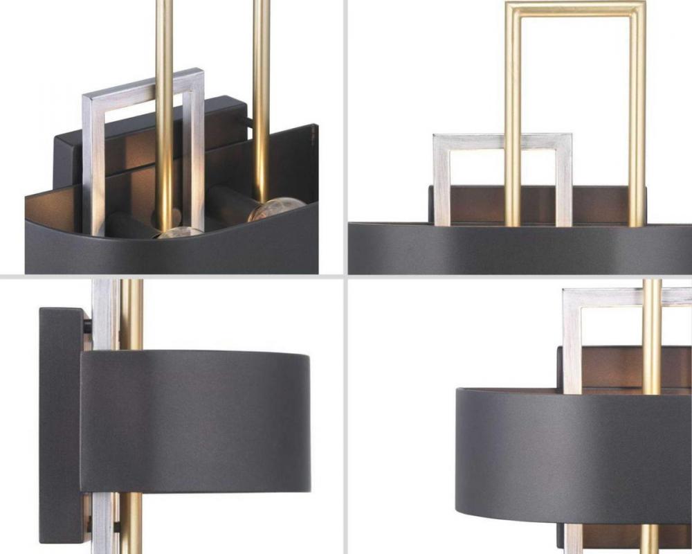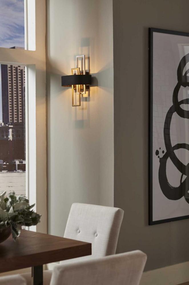 An array of geometric patterns in Adagio two-light wall sconce is a nod to the musical description of a tender and melodic tone. The modern design features lights that are distributed around a circular Black band. Mixed metal elements, which are present in Brushed Silver and Brushed Brass accents, can complement monochromatic color palettes that are popular in homes today. Each fixture in the Adagio collection creates a focal point and is ideal for Luxe and Modern interiors.