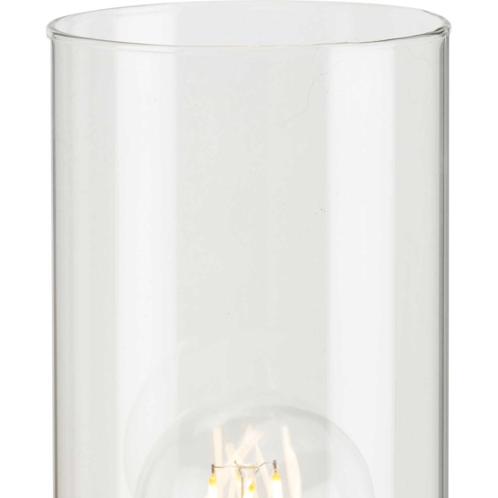 Simple round mounting plate holds a lamp bases light surrounded by an elegant clear cylindrical shade allowing illumination from the glowing light source within
