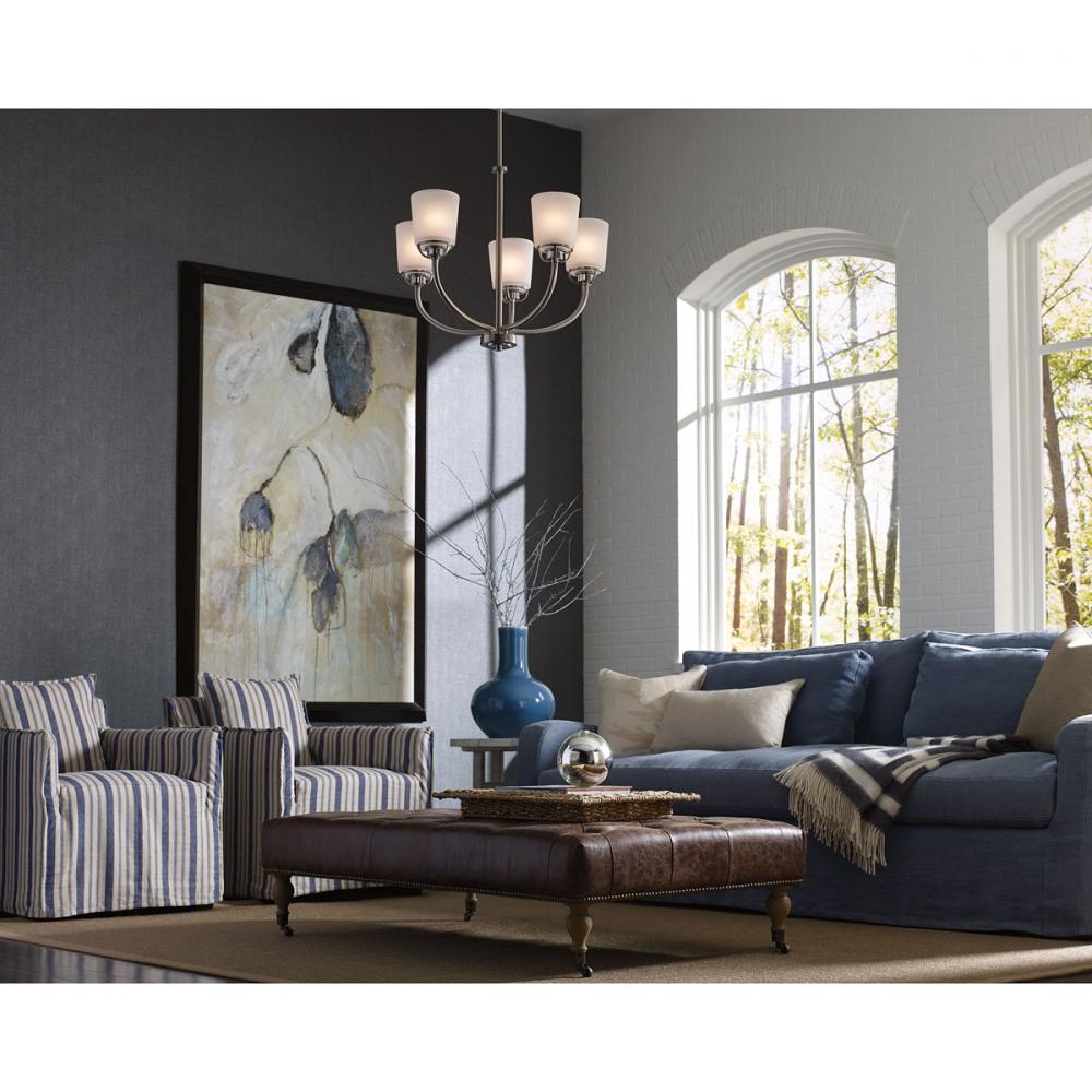 A modern form with industrial-inspired accents are featured in West Village. Double prismatic glass shades provide a beautiful illumination effect. Visual interest continues with a three-spoke design that holds each glass shade. Brushed Nickel with chrome accents provide touches of mixed metal. This five-light chandelier is part of our Design Series collections.
