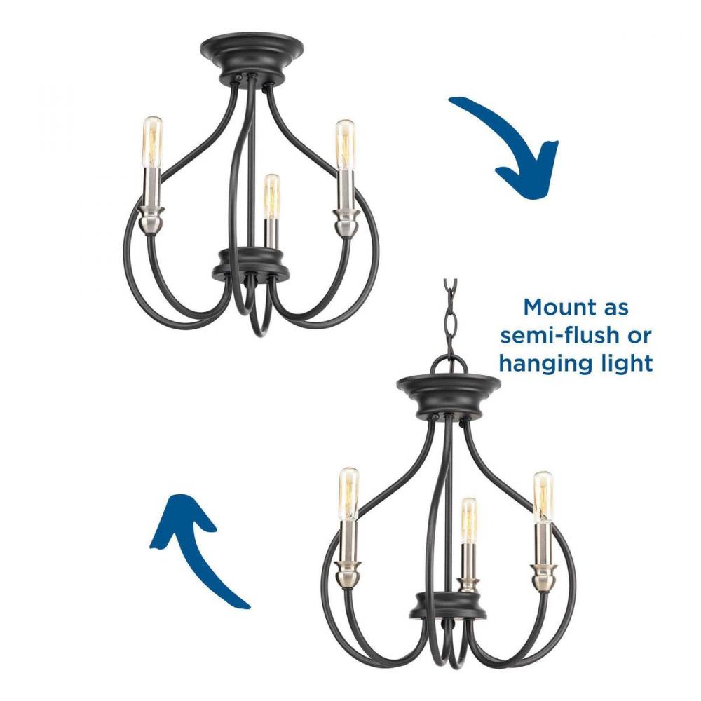 An updated traditional family, Whisp adds distinction to interior spaces. Candles with brushed nickel accents complement a gracefully scrolled frame in a cool Graphite finish. The three light semi-flush convertible can be chain hung or semi-flush to ceiling.