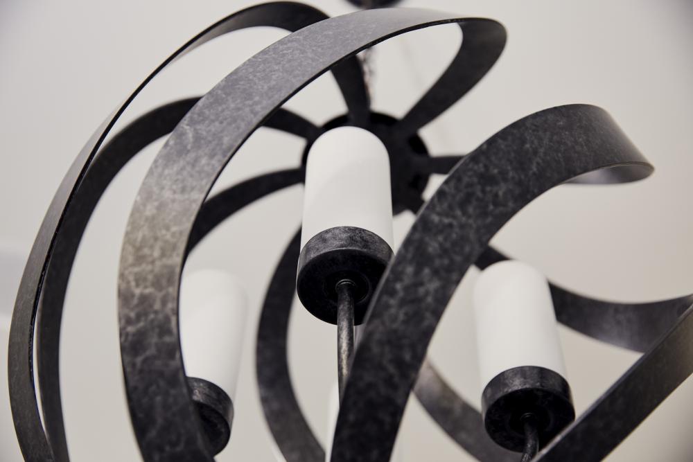 Bold yet graceful, the Blacksmith pendant fuses strength and artistry into a single striking form. Sweeping bands in an earth black finish twist into a sculptural sphere, cradling opal etched glass shades that glow like candlelight through rain-kissed wind