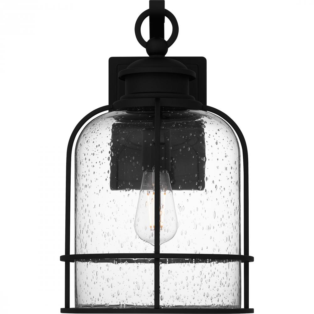 Bowles outdoor lanterns give a nod to both industrial and coastal design. The stately silhouette features clean lines, intricate hook detailing, and exposed bulb sockets - all in a classic Earth Black finish. Clear seedy glass completes the look, offering