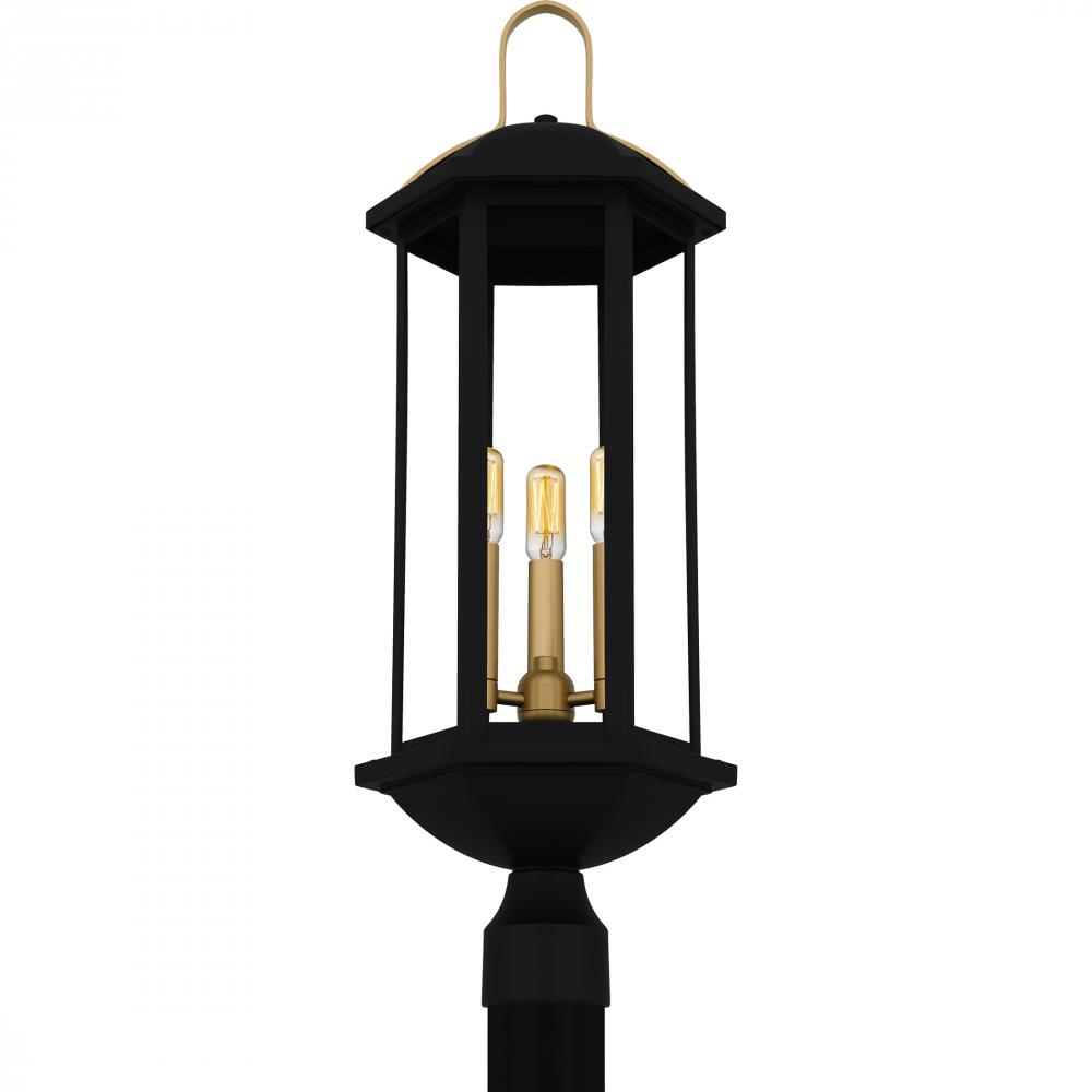 Illuminate your homes exterior with the timeless style of Crestfield lanterns. The elongated frame is finished in matte black and accented beautifully with brushed gold for a hint of luster and sophistication. Clear tempered glass panels complete the look