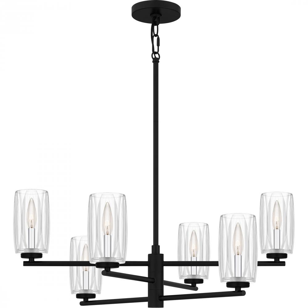 Matte black and clear crystal cut glass create a classic, elegant pairing. Whether above a dining room table or in a living room, the Cunningham chandelier adds a hint of glam in any setting. Candle covers are provided in two finishes, matte black and chro
