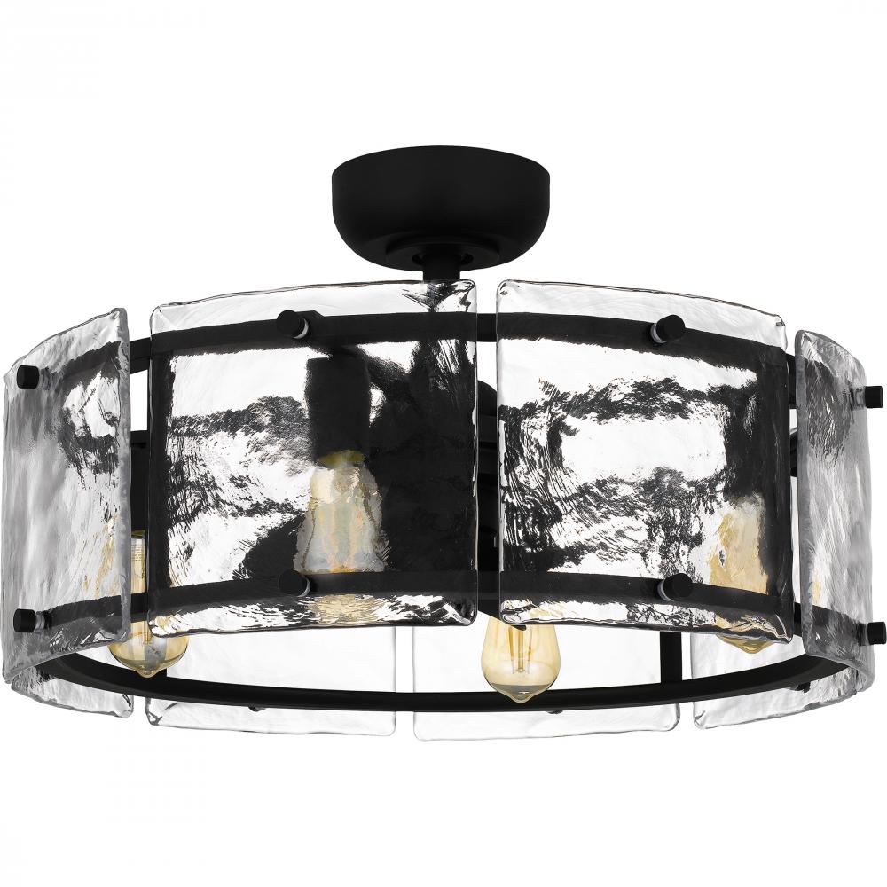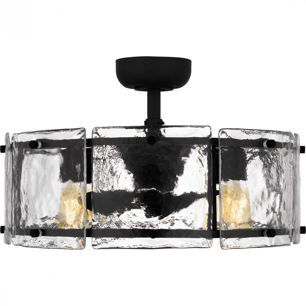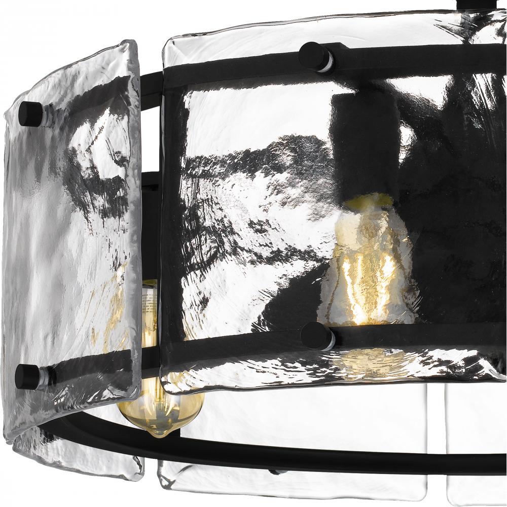 Panels of textured glass pair with an earth black finish to create the Fortress series. Offering simple yet striking design, Fortress is available as a mini pendant, semi-flush mount, pendant, or island light. As a fan light, this design comes in both eart