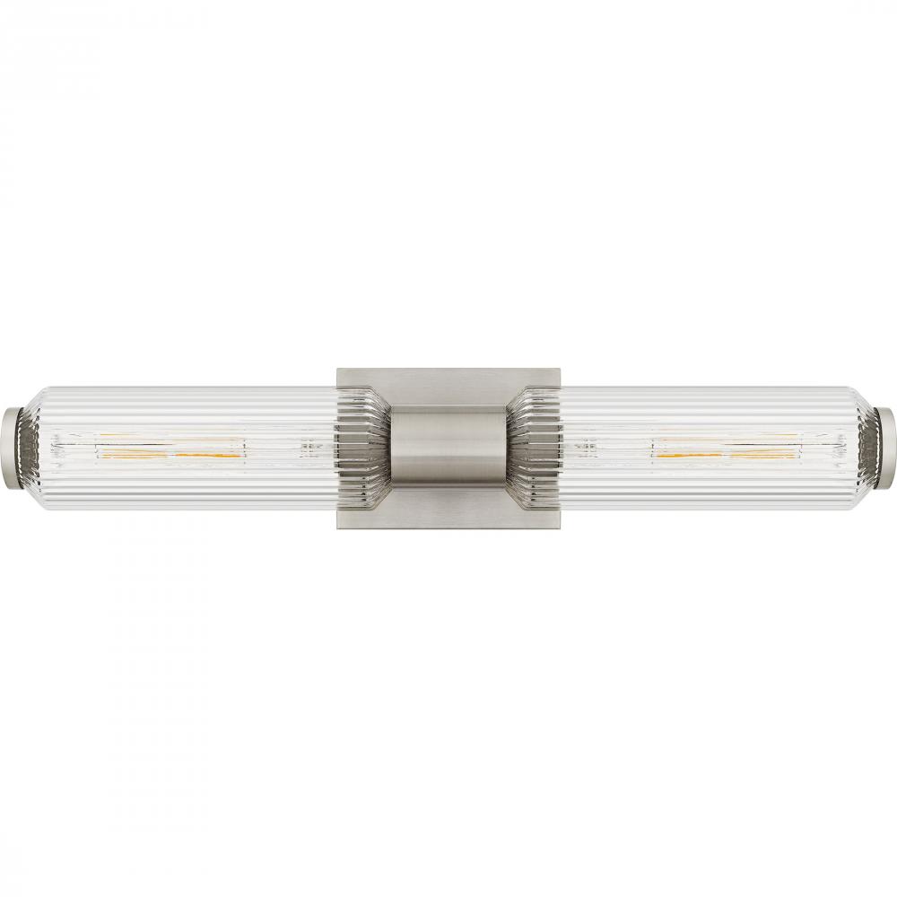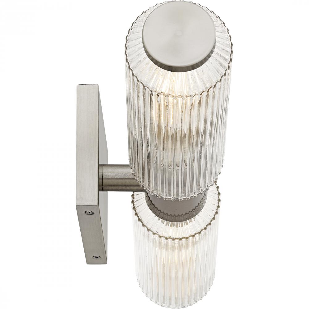 The Hawes bath light features a clean, geometric design with a striking visual impact. The two cylindrical ribbed glass shades cast a soft, diffused glow while adding a touch of texture to the space. The lights slender metal backplate, available in a versa