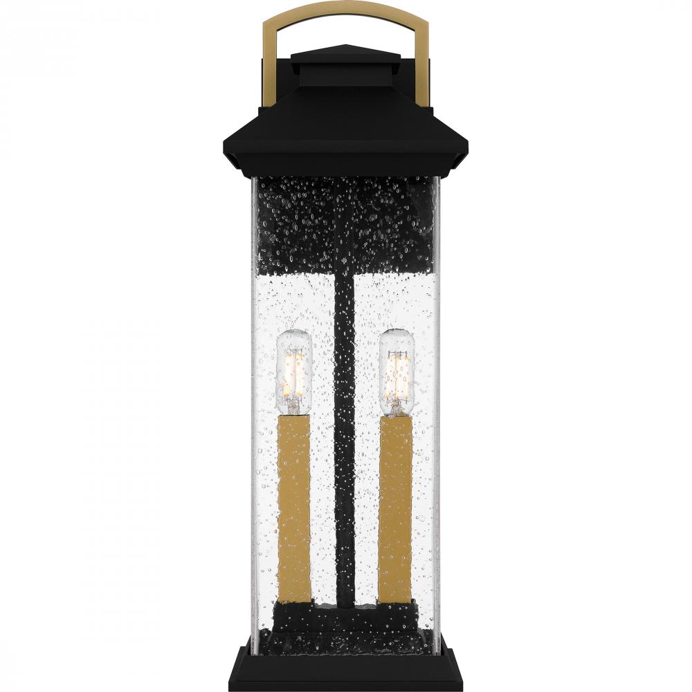 Adorn your homes exterior with Henderson outdoor wall lanterns. The rectangular silhouette is finished in earth black and features gold accents for an extra hint of modern style and luxury. Clear seedy glass shades add sparkle to the overall design, making