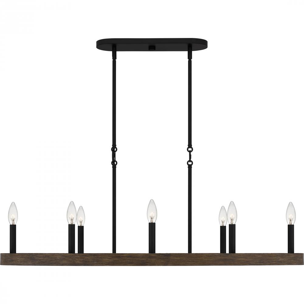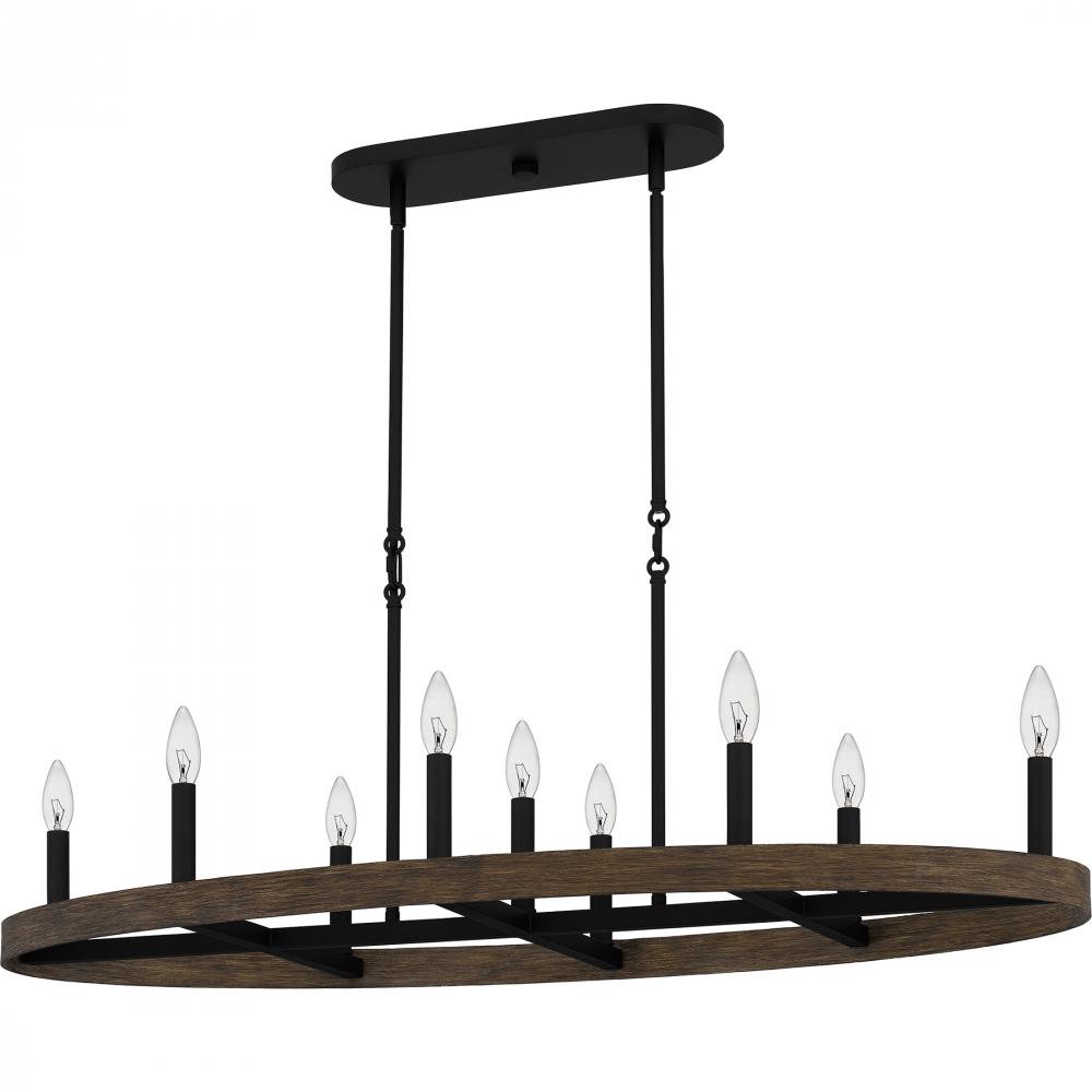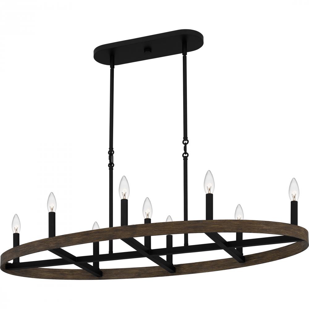 Embrace modern farmhouse design with the Hendrix linear chandelier. Tall, slender candle sleeves rise from an oval-shaped wood accent piece for a touch of industrial whimsy. A matte black finish completes the unique look, making Hendrix the perfect choice
