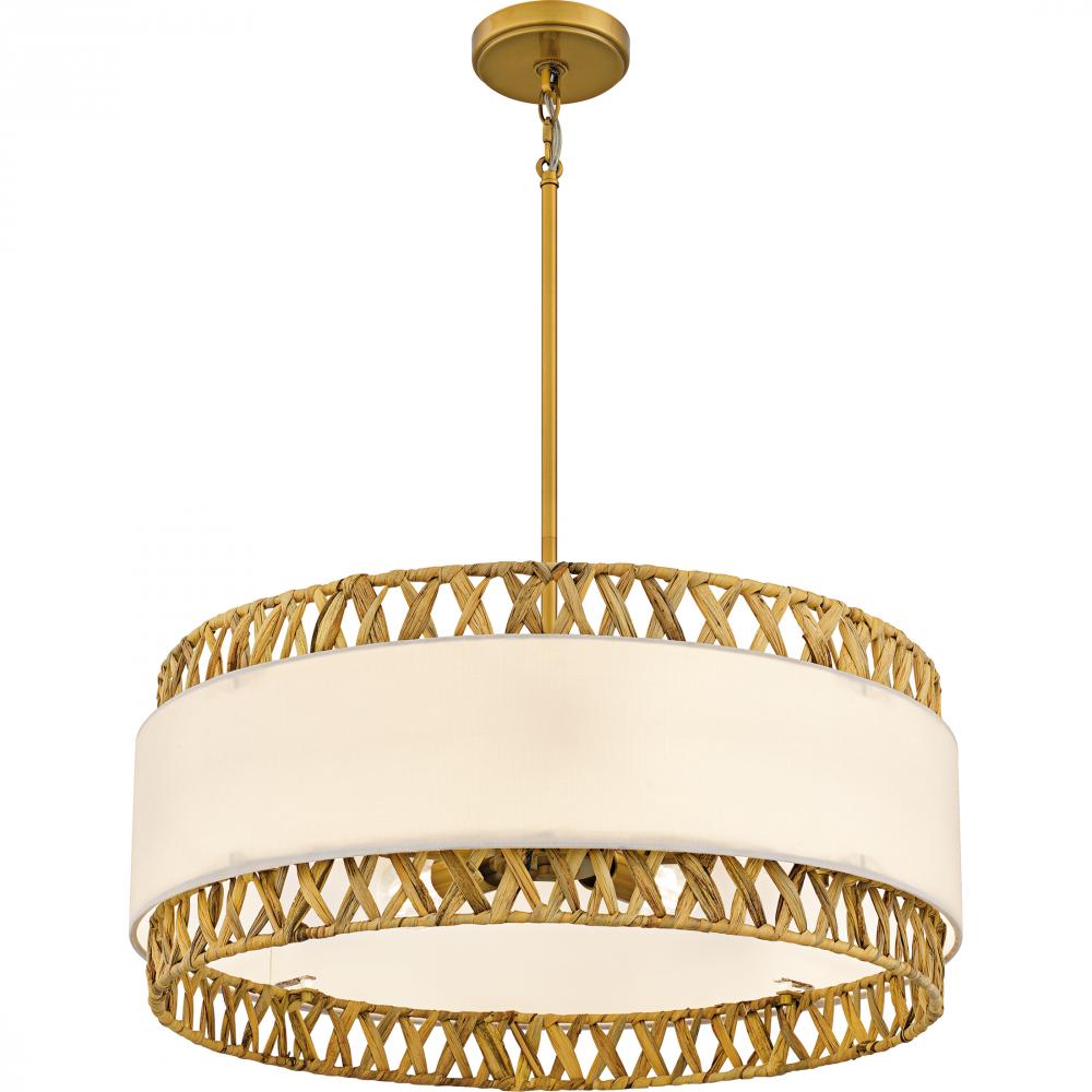 Part of the Quoizel Naturals series, Kate makes a distinctive statement with its combination of rattan and fabric shades. Finished in brushed gold, Kate embodies coastal style with its natural and elegant design elements. Available as a pendant, mini penda