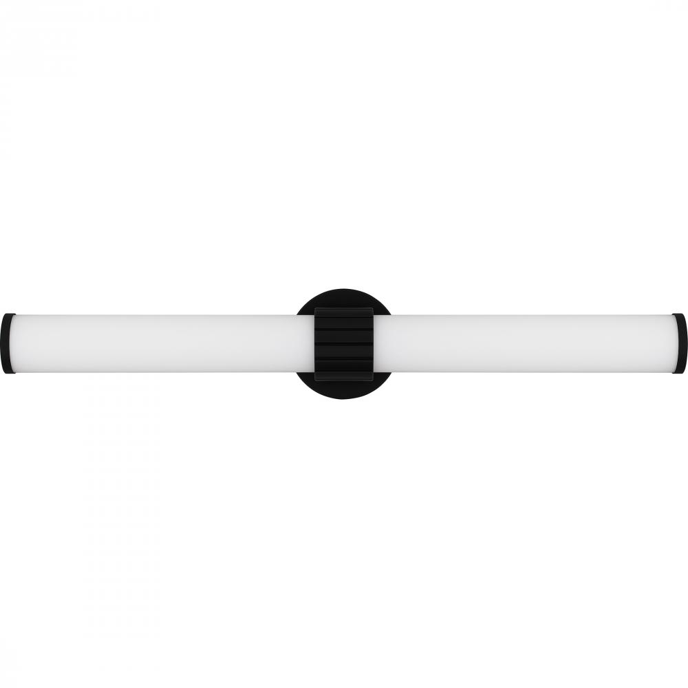 Upgrade your bathroom with the modern style of Kaye. An integrated LED light source shines brightly through the linear etched glass shade, complemented by sleek metal bands. Choose from a variety of sizes, available in your choice of matte black or aged br