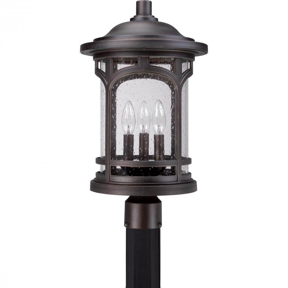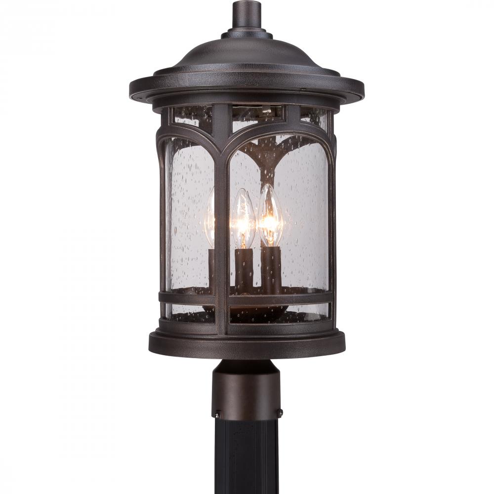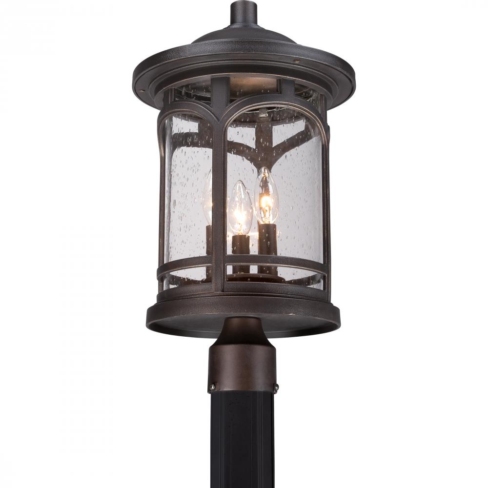 Marblehead is a rich masculine outdoor series and a welcome addition to the Quoizel Coastal Armour Collection. The stately form of the metal arches gives the clear seedy glass a window like appearance. Made from a new weather resistant outdoor composite