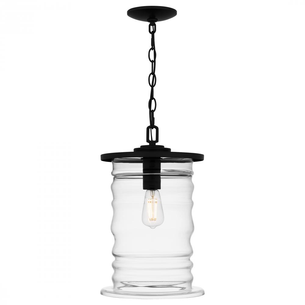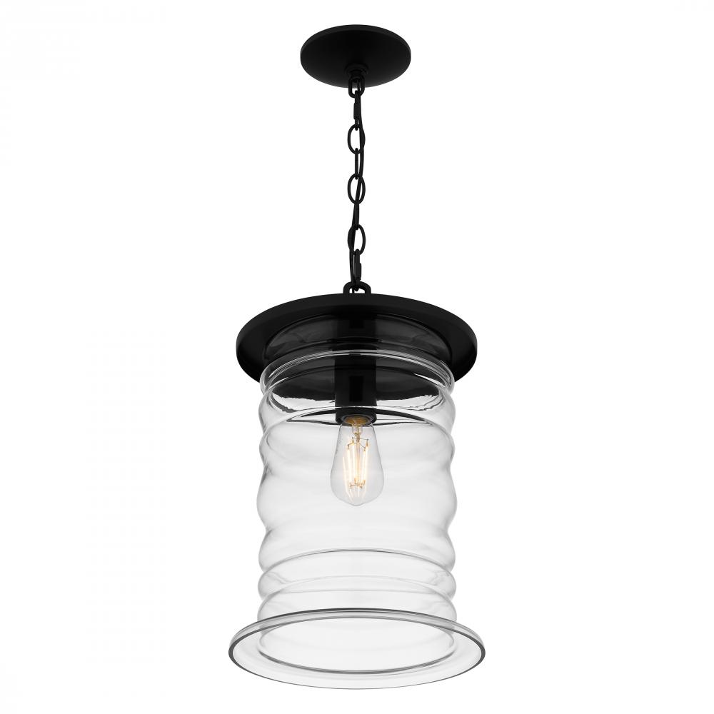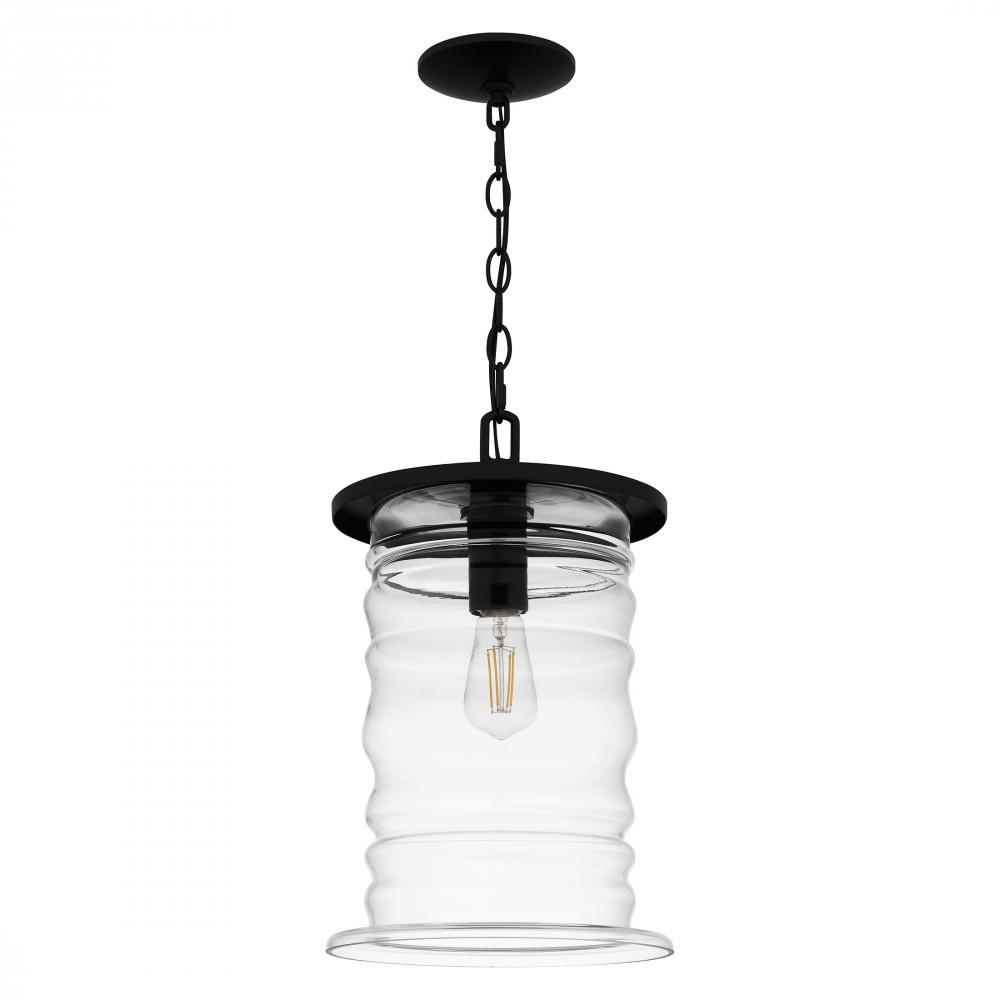 The Noland mini pendant light makes a beautiful addition to any homes exterior. Surrounded by a sleek matte black frame, the distinctive clear glass shade features a soft rippling design reminiscent of an ocean wave. Also available as an outdoor hanging la