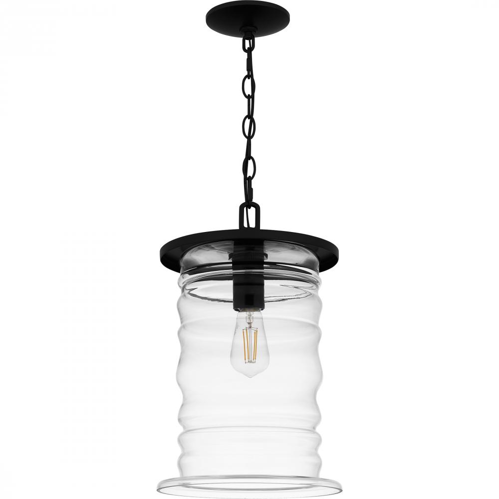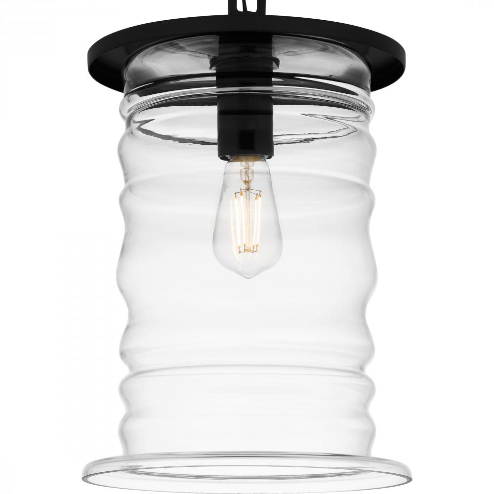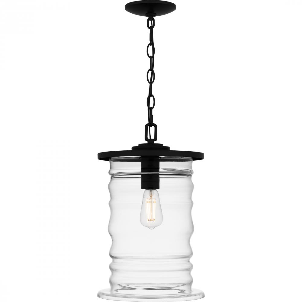 Noland outdoor lanterns make a beautiful addition to any homes exterior. Surrounded by a sleek matte black frame, the distinctive clear glass shade features a soft rippling design reminiscent of an ocean wave. Available as a hanging lantern or various size