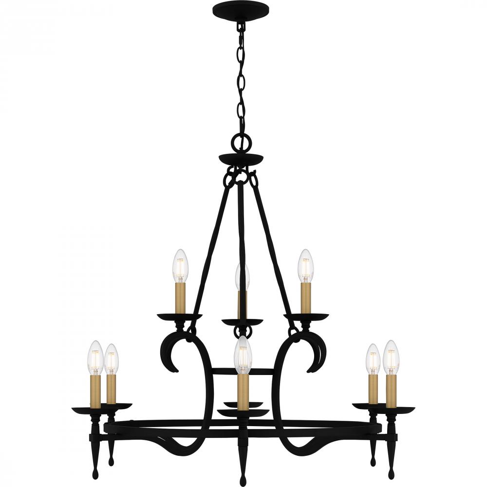 Elegant scrollwork and aged brass accents make Octavia a standout in any room. The earth black silhouette features delicately curving arms and aged brass candle sleeves for a pop of shimmering gold. Octavia is available as a chandelier or wall sconce, and