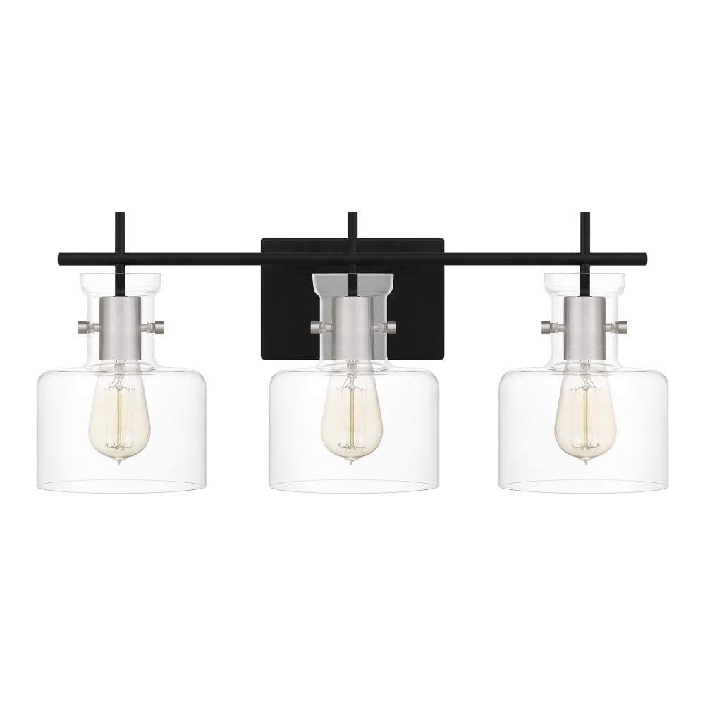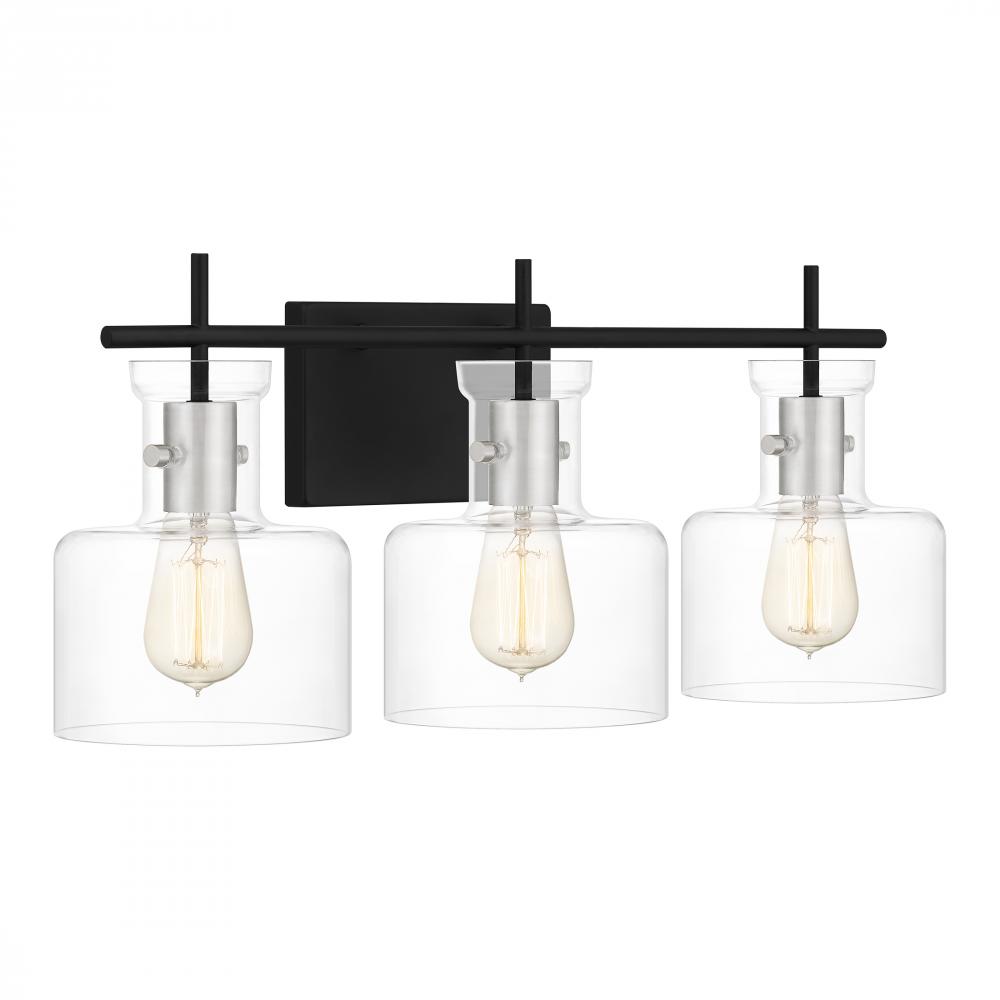 A matte black finish includes a hint of shine, courtesy of brushed aluminum accents, in the Pensbury bath light. With clear glass shades to maximize radiance, the light comes in either three or four bulbs. The black-and-silver colorway adds a refined touch