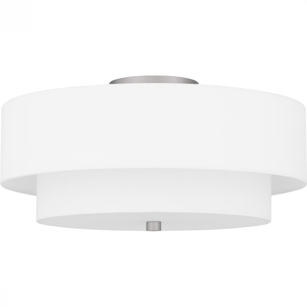 Prewetts understated style provides a soft transitional look for most any room. The white fabric shade diffuses the light evenly, illuminating your home with a warm ambiance. Finished in brushed nickel, the Prewett semi-flush mount is a stylish choice in a
