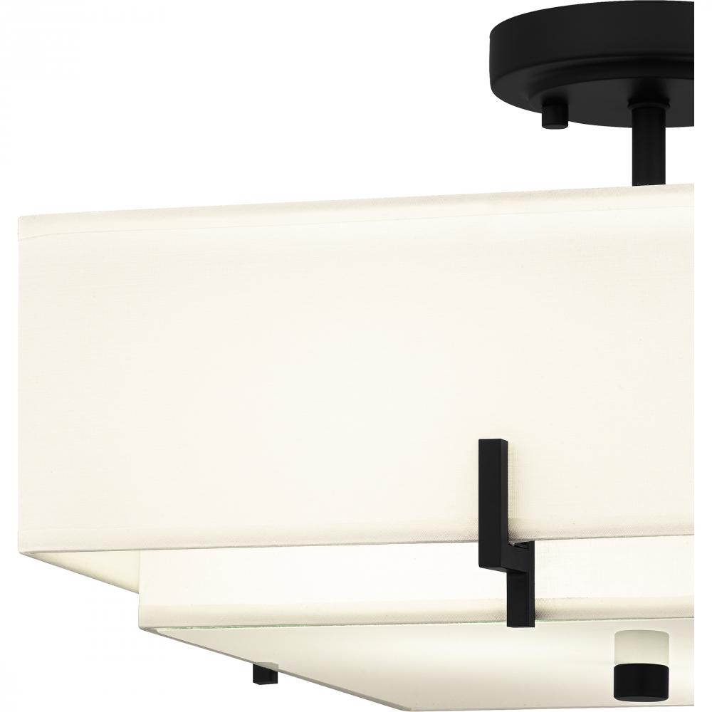 Cast a warm glow with the Renzo semi-flush mount. A square beige fabric shade surrounds a smaller shade for a unique, layered look. A matte black finish and matching geometric accents add to the transitional feel, making Renzo a perfect choice in any hallw