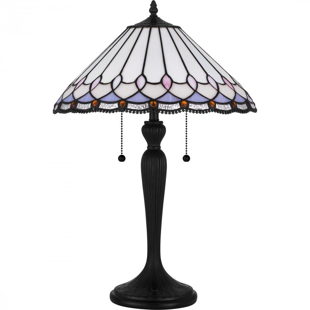 With a matte black finish and classic design, the Inez table lamp delivers on both style and function. The pretty shade is made of handcrafted Tiffany glass in shades of cream, pink, and purple for a feminine touch. The individual glass pieces are hand ass