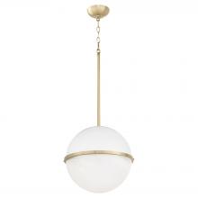 This eclectic one-light pendant is the perfect lighting solution for any modern industrial or nostalgic transitional space. A two-tone spherical shade with a studio white cap and milky glass base is divided by a vintage-inspired capture ring. Decorative screws pair with a matching aged brass chain and stem hanging system to complete the look.