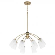 The Arpeggio collection features modern pendant light fixtures with a sleek, contemporary design. Rods extend down to a duo of cylinders from a circular mounting plate. Eight curved arms extend downwards from the central piece, each ending in a satin opal glass shade that houses a candelabra socket. The overall style combines elements of industrial and minimalist aesthetics. Choose from matte black or aged brass finishes.