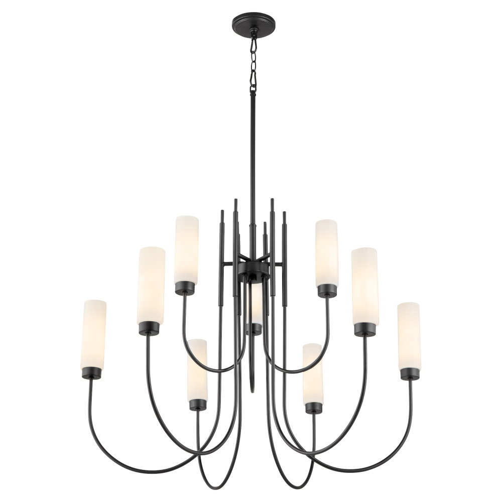 Jerome is a transitional design with a historical inner character. Its wire-like arms carry a lightness and borrow inspiration from the Swedish school and early American styles. Jerome is comfortable bringing a regal presence to spaces across various genres. Finished in matte black with white milky glass, the Jerome chandelier comes in 6 or 9 light arrangements.