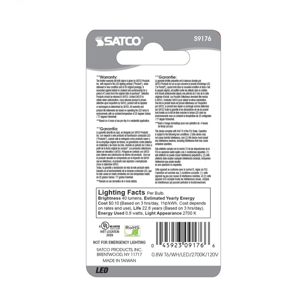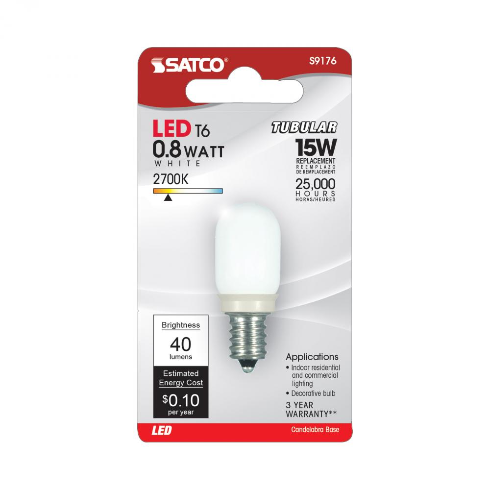 0.8 Watt LED; T6; Frost; 2700K; Candelabra base; 120 Volt; Carded