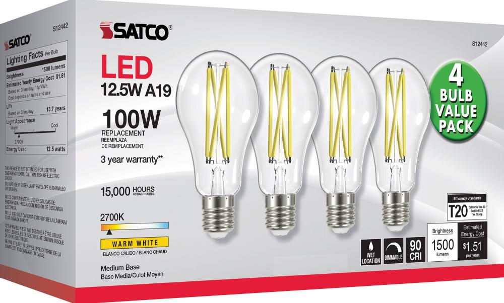 12.5 Watt A19 LED Filament; 100 Watt Replacement; Clear; Medium base; 2700K; 120 Volt; 4-Pack
