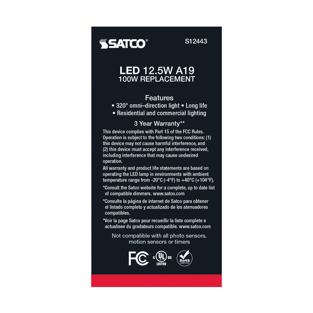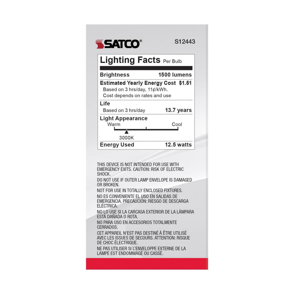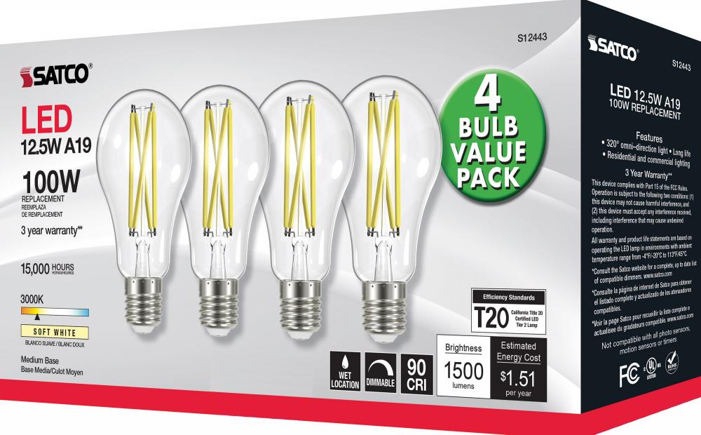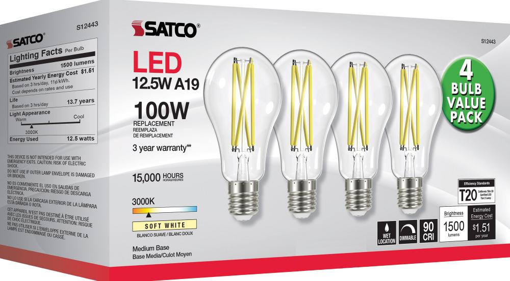 Satco's S12443 12.5-watt LED lamp is traditional, yet contemporary with its clear finish and energy saving LED technology. Elegantly illuminate any room in the house with this 4 pack of dimmable bulbs. Sophisticated and modern, this lamp delivers 15,00