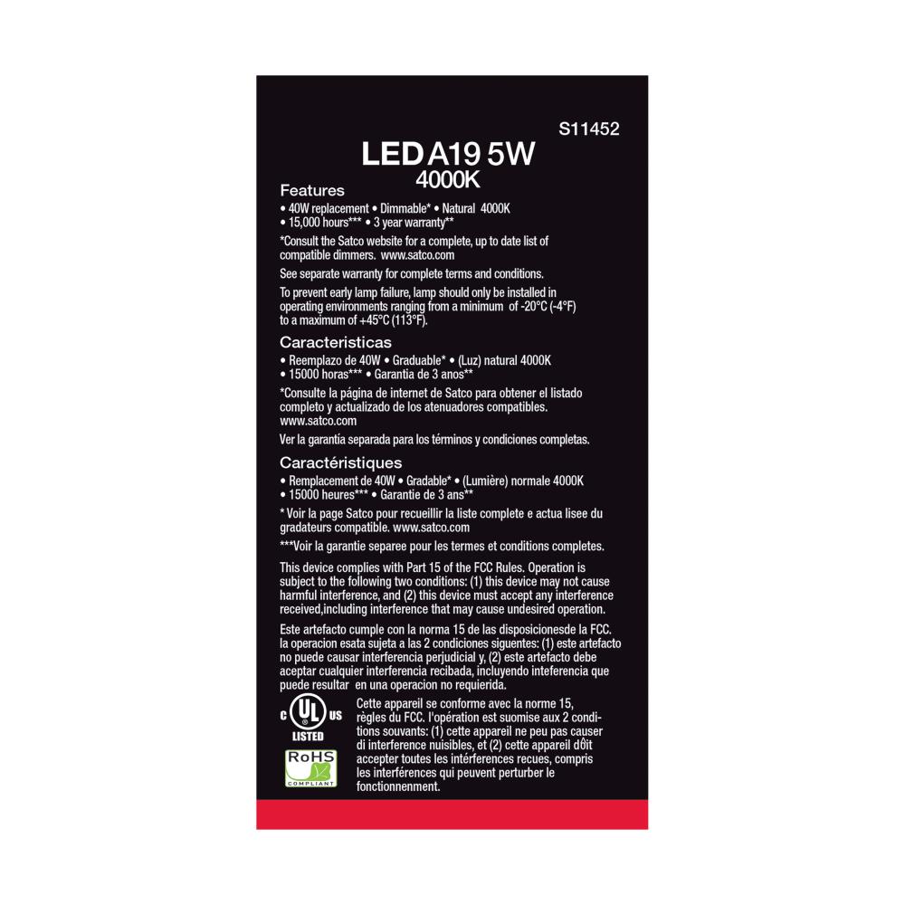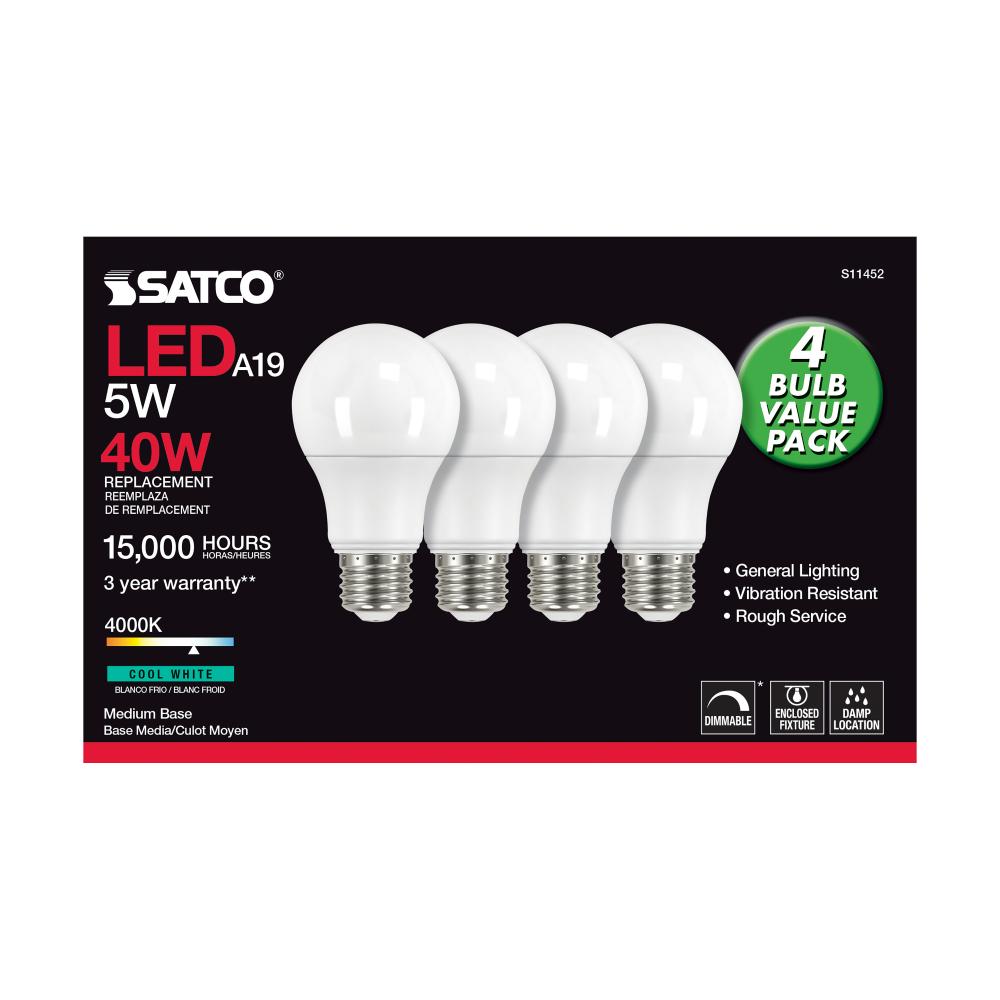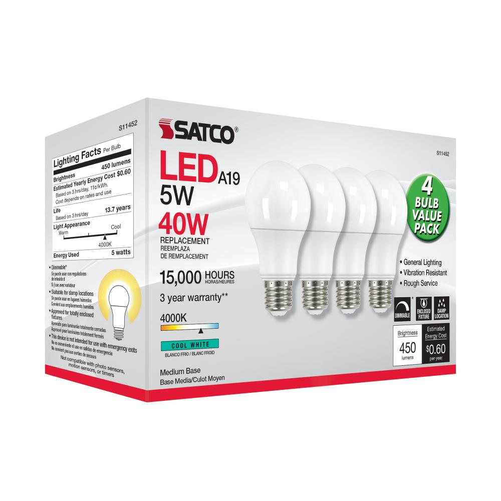 5 Watt A19 LED; 4000K; Dimmable; Medium base; 230 deg. Beam Angle; 4-pack