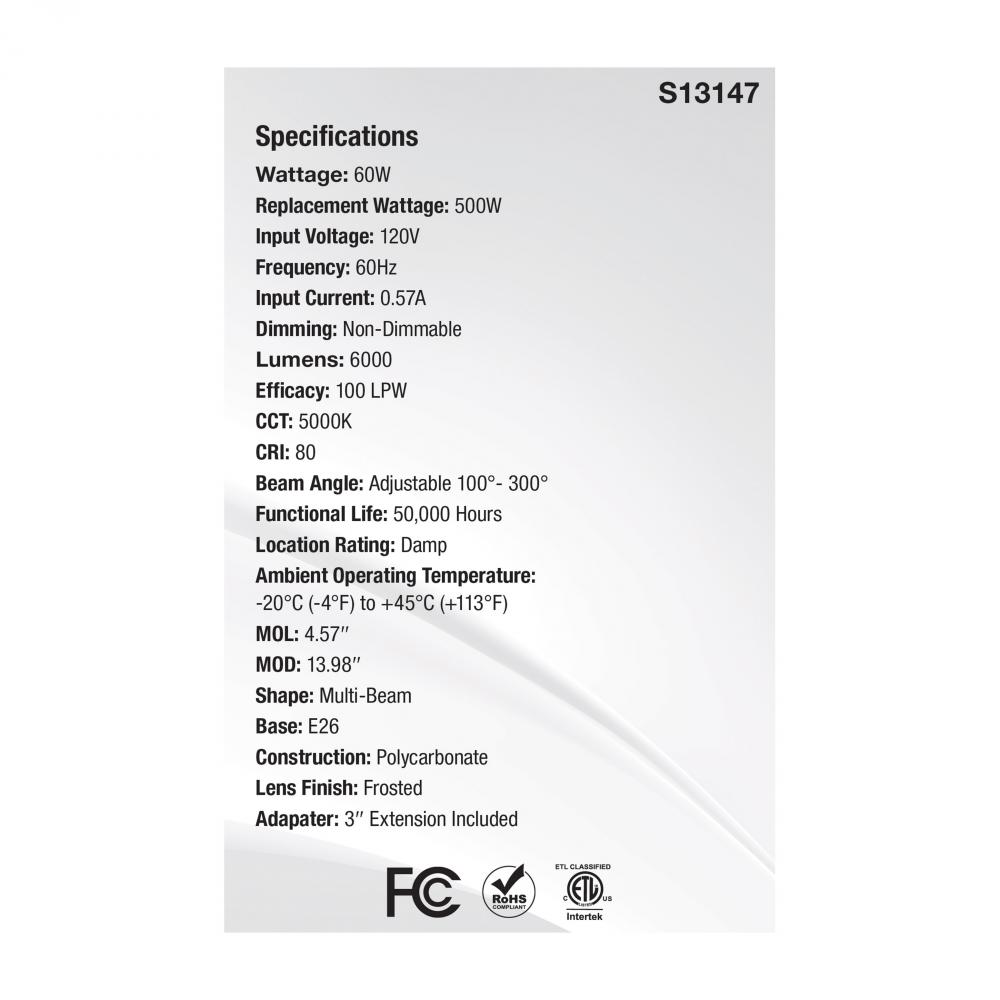 60 Watt LED Multi-Beam Utility/Garage Lamp; 5000K Natural Light; White Finish; 120 Volt