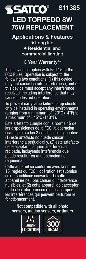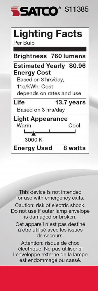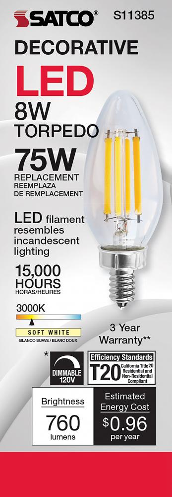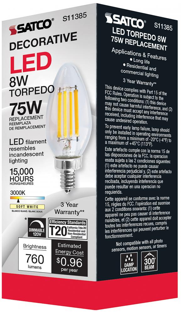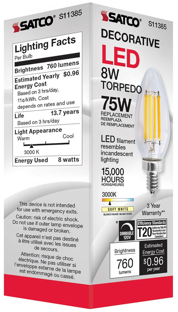 Satco's S11385 8-watt LED bulb is an elegant lighting solution for the home. Perfect for chandeliers, use this dimmable lamp to illuminate living rooms, dining rooms, or anywhere else where a traditional look will complement decorative needs. The bulb