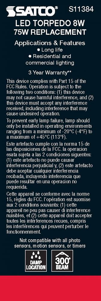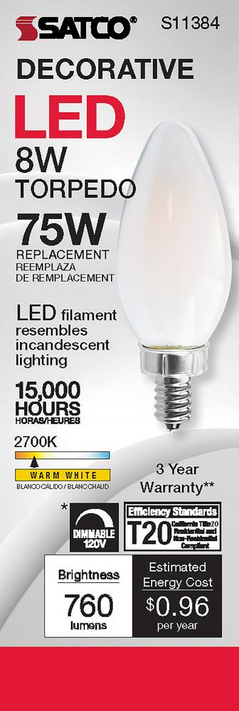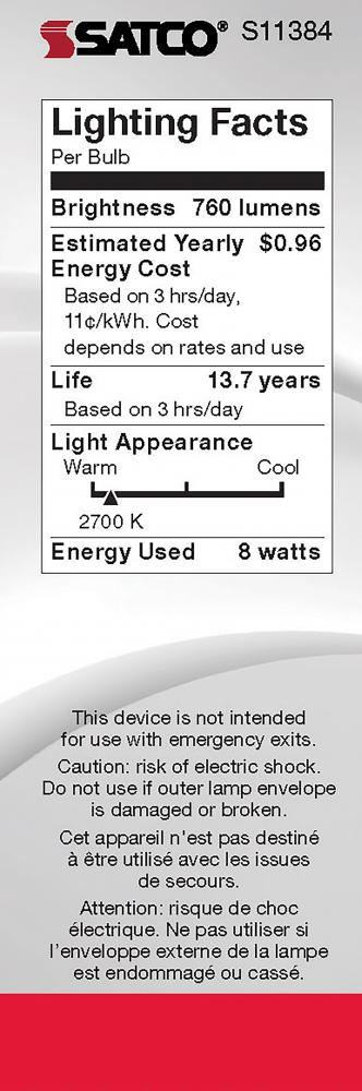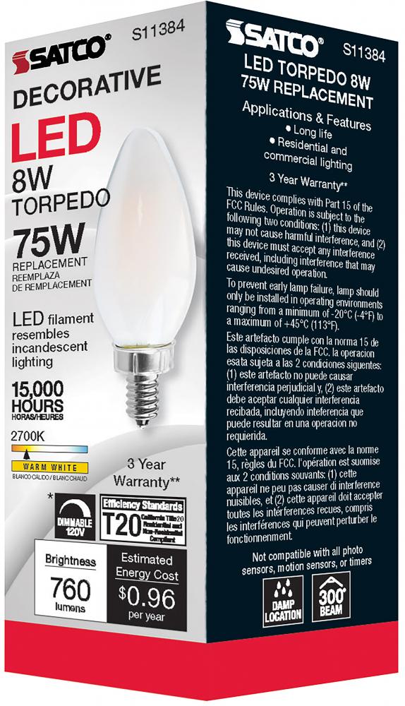 Satco's S11384 8-watt LED bulb is an elegant lighting solution for the home. Perfect for chandeliers, use this dimmable lamp to illuminate living rooms, dining rooms, or anywhere else where a traditional look will complement decorative needs. The bulb