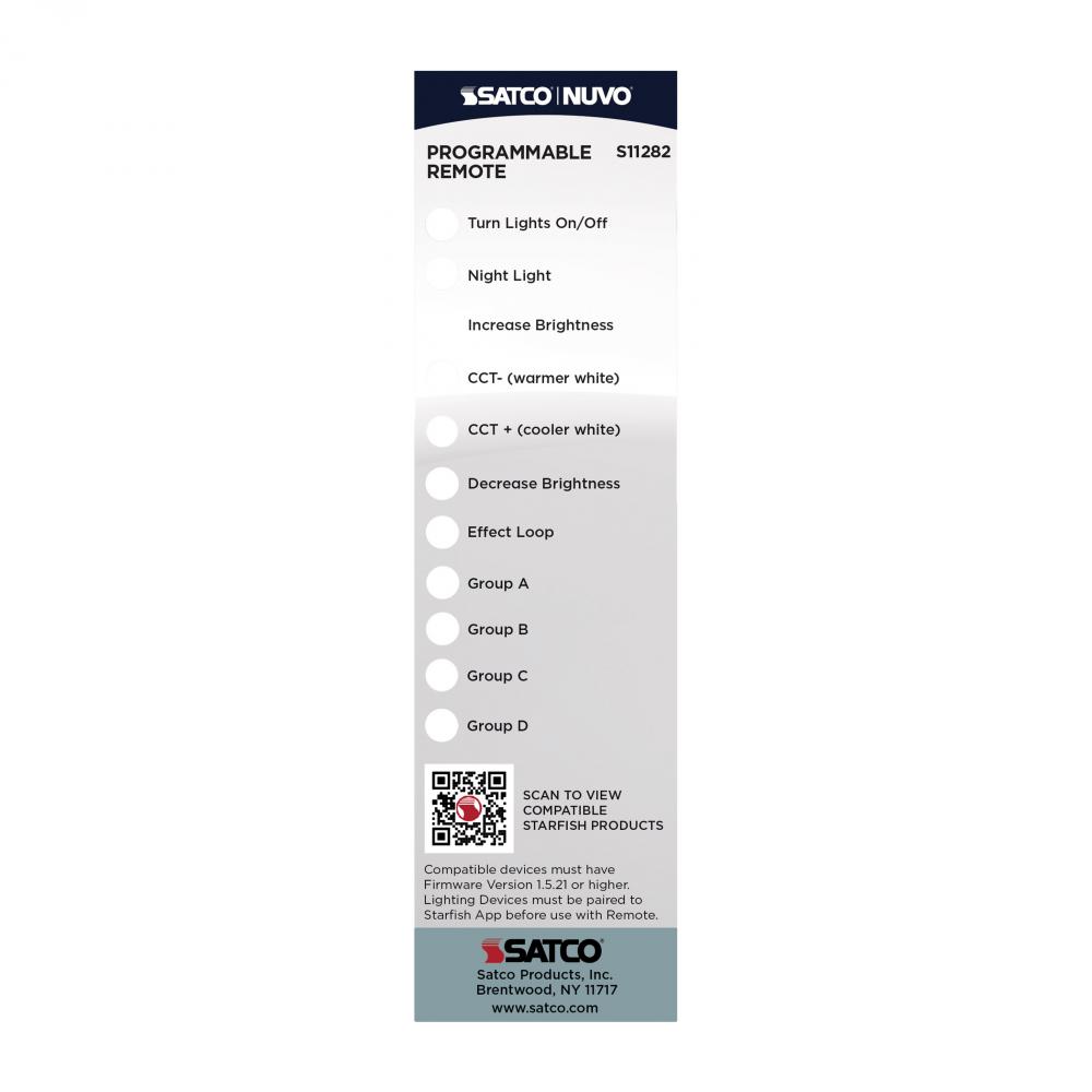 The STARFISH by SATCO Programmable Smart Remote offers alternative control over smart lighting, once the lighting devices are paired to the STARFISH App. Users can adjust the lighting within a 50-foot radius, allowing for convenient remote operation across multiple devices. The remote enables control over key lighting parameters, including brightness levels, color temperature adjustments, and the ability to cycle through a range of colors and dynamic effects. These features provide users with a customizable and versatile lighting experience, perfect for creating specific atmospheres or enhancing the functionality of any space. The integration of the programmable remote in conjunction with the Starfish App, ensures an intuitive and responsive interface for a wide range of lighting operations.