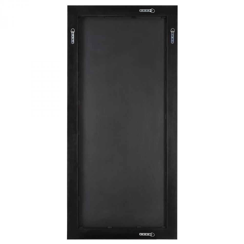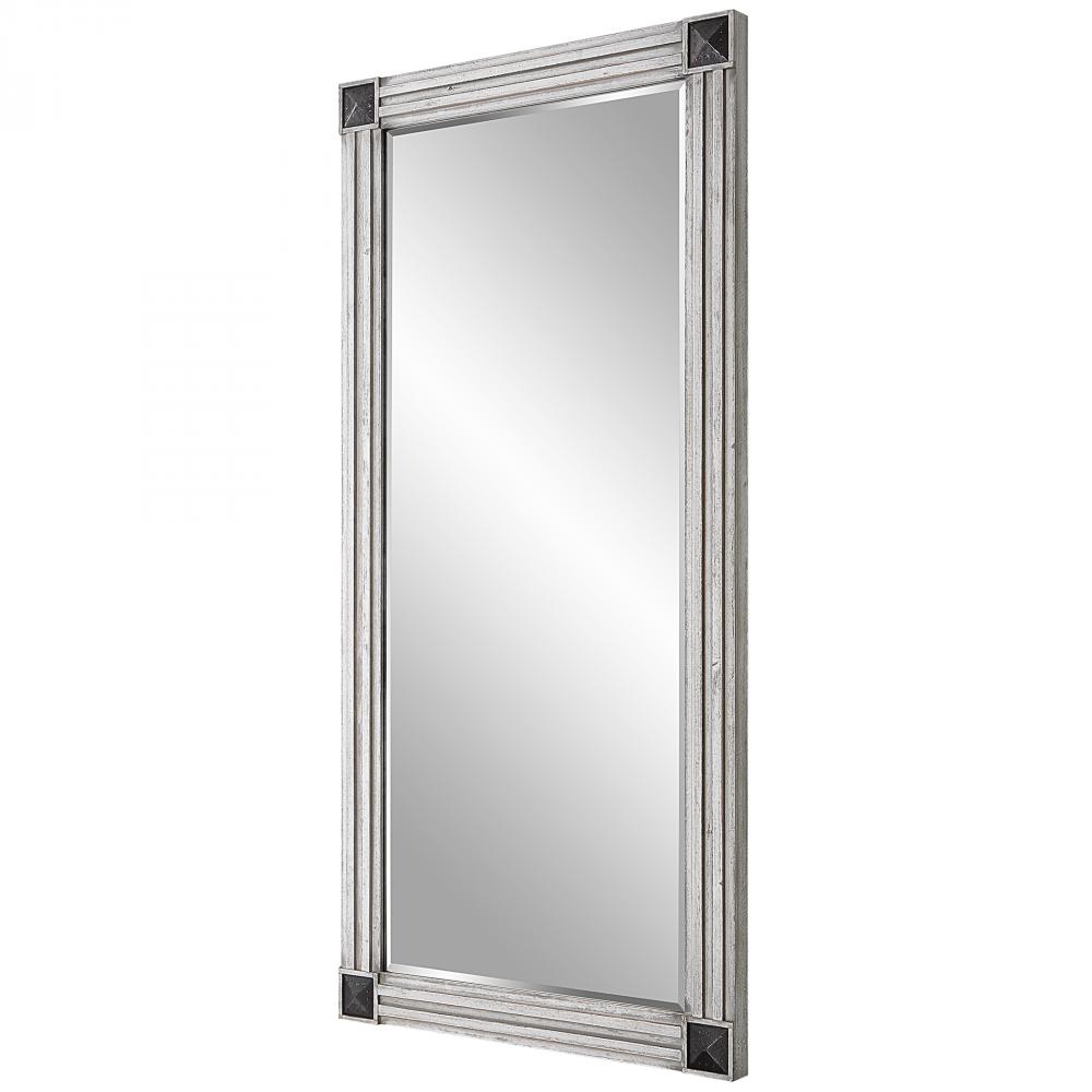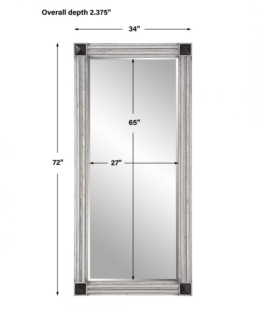 This oversized mirror exudes a stately feel with rustic character. The frame is crafted from solid Fir wood finished in a heavily distressed white wash with gray undertones. Aged dark bronze accents with nail details adorn each corner. Mirror has a 1 1/4"