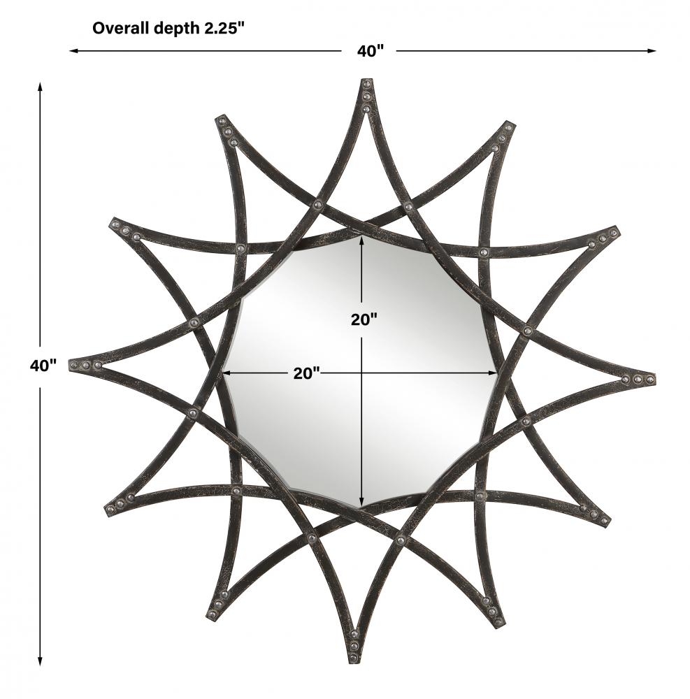 Handcrafted from forged iron, this mirror showcases a star-shaped frame finished in an aged crackled charcoal with a light gray glaze and antiqued silver rivet like accents.