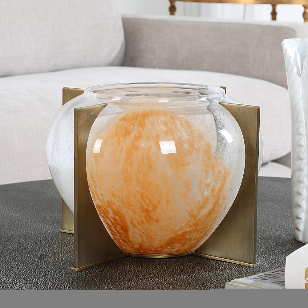 This Unique Decorative Vase Features A Large, Round Glass Body With A Striking Blend Of Warm Amber And White Hues, Creating A Soft Gradient Effect. Supported By A Minimalist Metal Stand With Four Sleek Panels Finished In Warm Brass. This Design Adds A Modern, Artistic Flair To Any Space. Ideal For Showcasing Flowers Or As A Standalone Centerpiece, This Vase Is Both Functional And Stylish, Perfect For Elevating Contemporary Interiors.