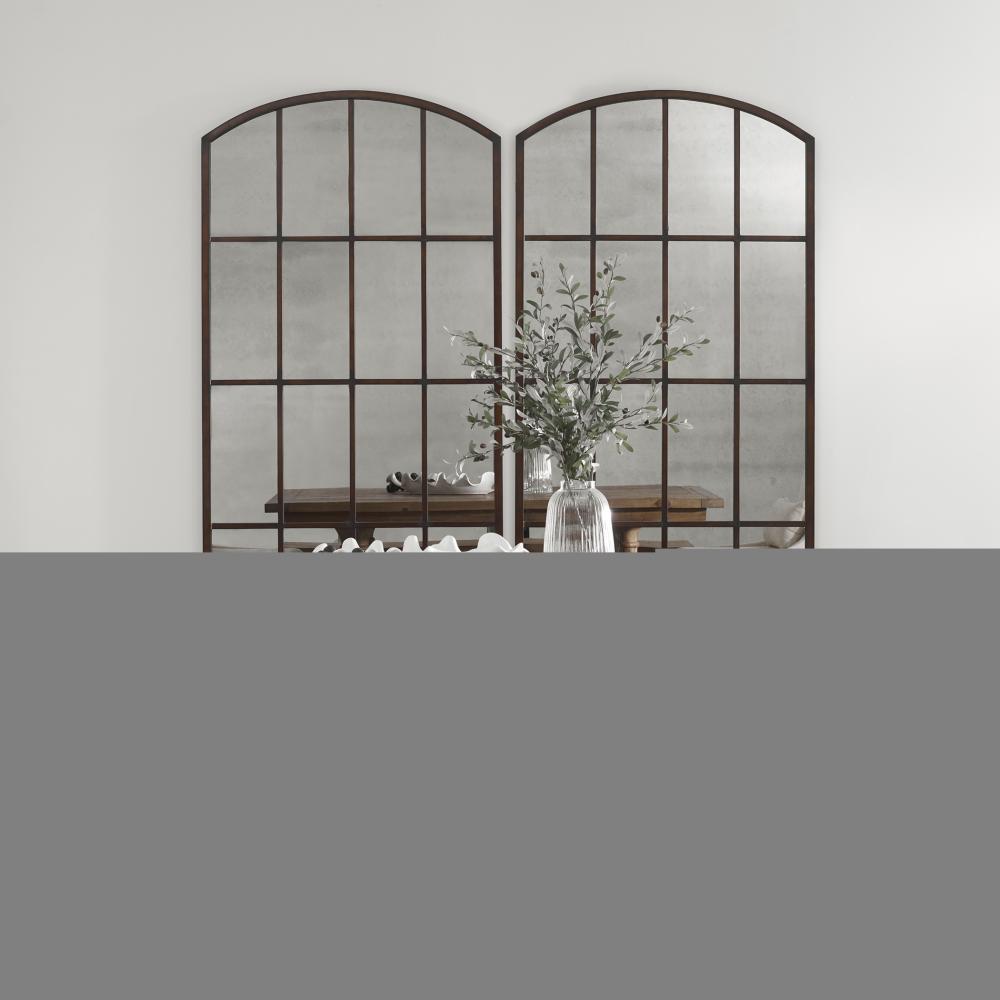 This Oversized Arch Features A Forged Iron Frame in A Hand Applied Warm Bronze Finish with Burnished Distressing Encasing An Antique Style Mirror.