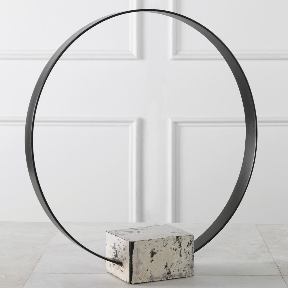 This Circular Metal Sculpture is Finished in A Brushed Satin Black Anchored By A Natural White Coral Stone Base with Black Accents.