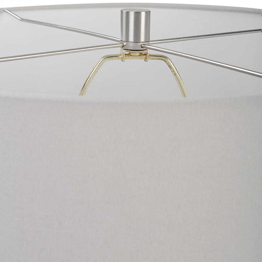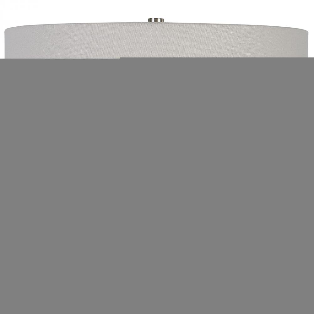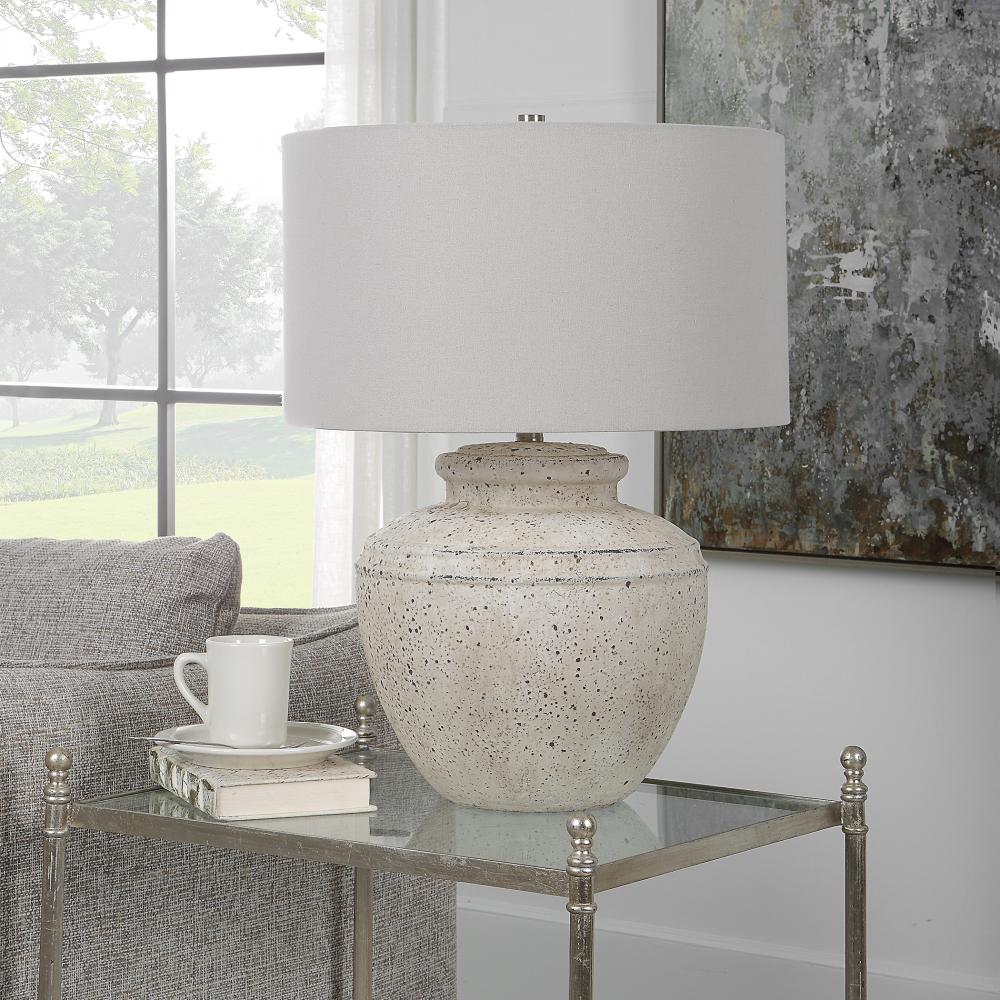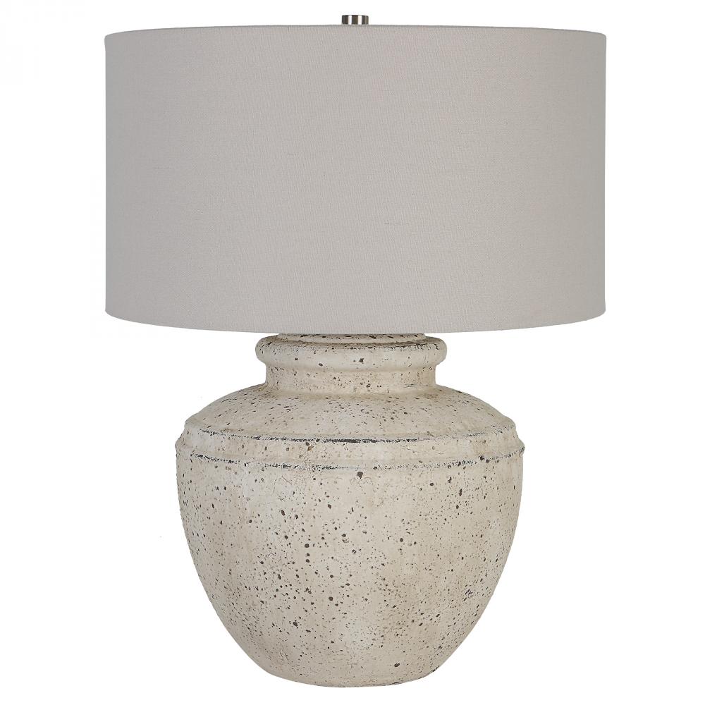 Inspired By Antique Pottery, This Ceramic Table Lamp Features An Aged Stone Finish with Character Distressing and Dark Undertones, Accented with Plated Brushed Nickel Details. The Drum Shade is Covered in A Light Gray Linen Fabric.