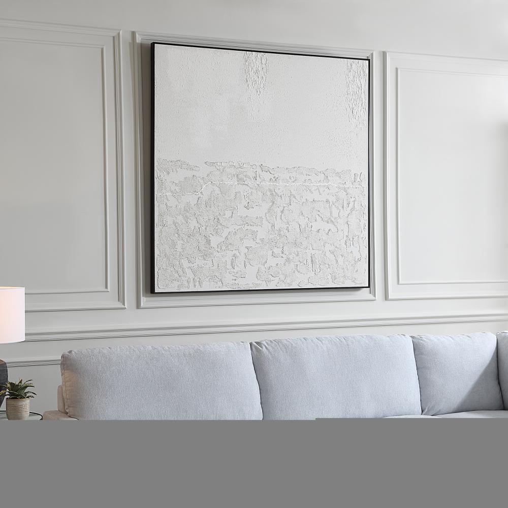 Below The Surface Hand Painted Canvas Speaks Volumes With Its All-white Palette And Intriguing Heavy Texture. A Slim, Black Gallery Frame Completes The Artwork. Due To The Handcrafted Nature Of This Artwork, Each Piece May Have Subtle Differences.