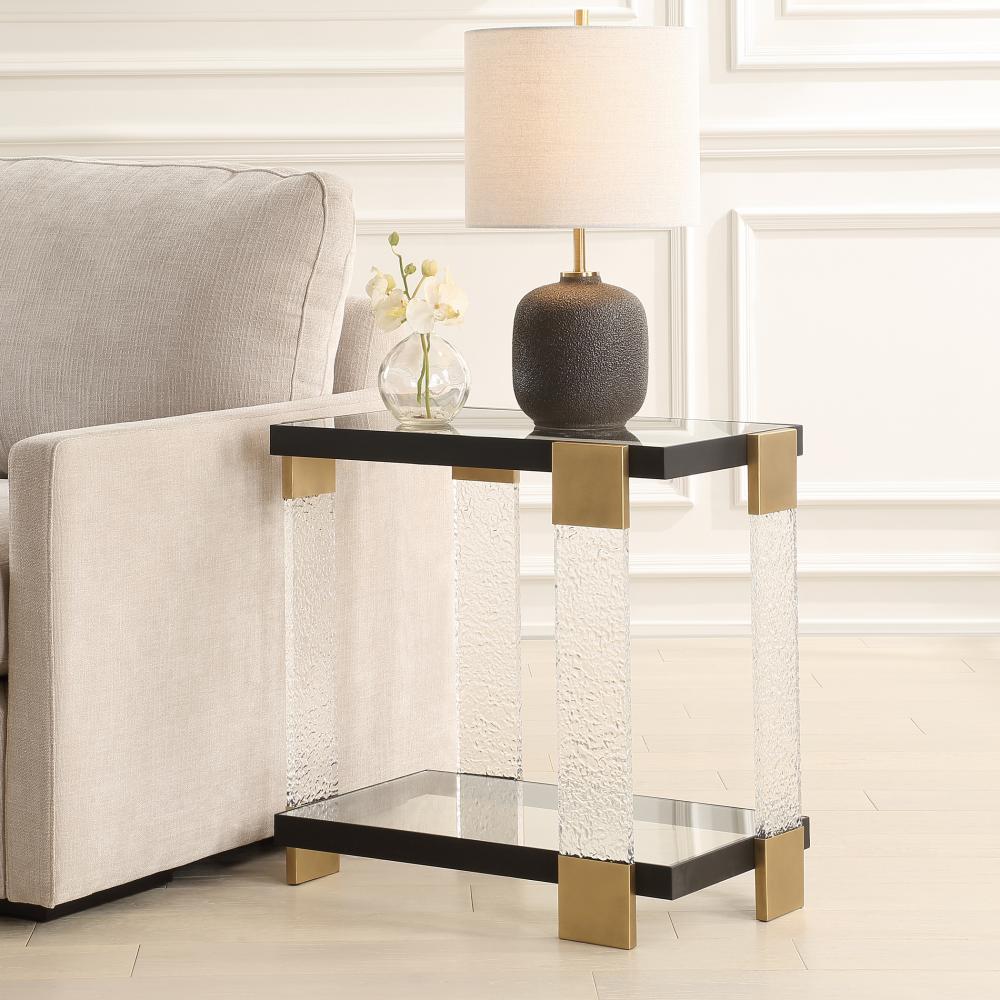 With Its Sleek, Clean Lines And Textured Acrylic Legs, This Uniquely Designed Side Table Features A Satin Black Iron Frame With Brass Finished Collars That Add A Touch Of Elegance To Any Room. The Table Is Complemented By Both A Tempered Glass Top And Bottom Shelf.