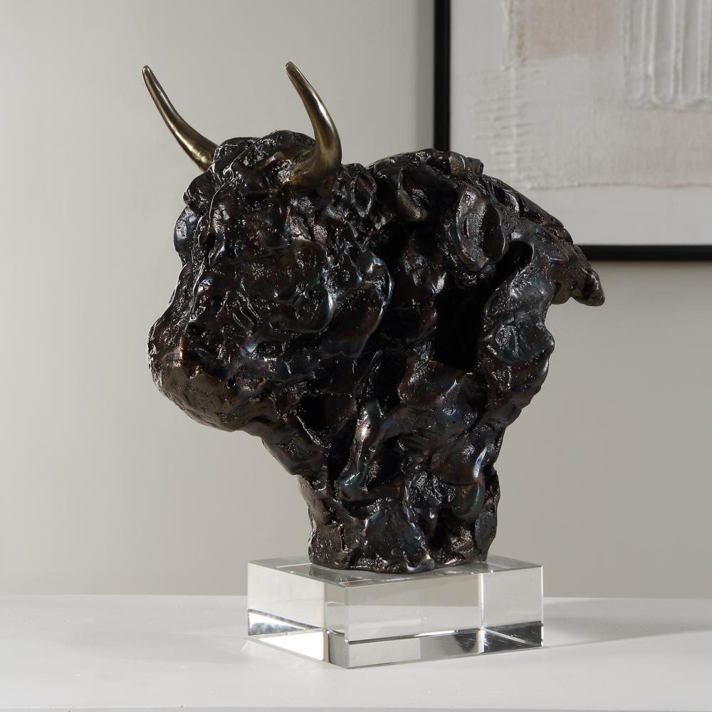 Introducing Our Exquisite Bison Bust, A Majestic Symbol Of Strength And Elegance. Crafted In Tarnished Bronze With Gleaming Gold Antlers, This Stunning Piece Exudes Timeless Sophistication. Poised Atop A Shimmering Crystal Base, It Commands Attention And Adds A Touch Of Luxury To Any Space.